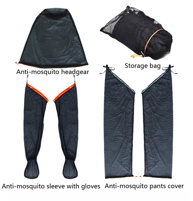 Lista de productos: 1. Capucha de malla 2. Manga de mosquito 3. Pantalones de mosquito 4. Bolsa de almacenamiento de traje