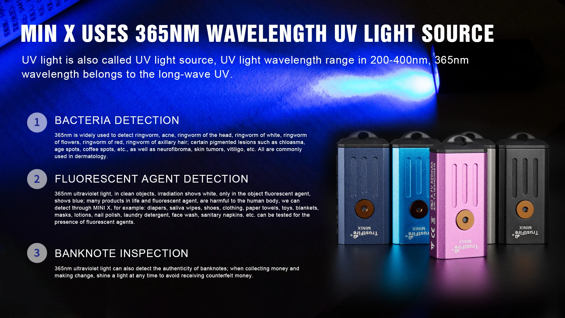 Luz ultravioleta de 365nm, en objetos limpios, la irradiación muestra blanco, solo en el agente fluorescente del objeto, muestra azul; muchos productos en la vida y el agente fluorescente, son dañinos para el cuerpo humano, podemos detectar a través de MINI X, por ejemplo: pañales, toallitas salivales, zapatos, ropa, toallas de papel, Juguetes, mantas, máscaras, lociones, esmalte de uñas, detergente para ropa, lavado de cara, toallas sanitarias. Etc. Se puede probar la presencia de agentes fluorescentes.