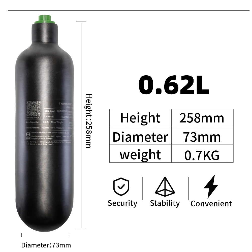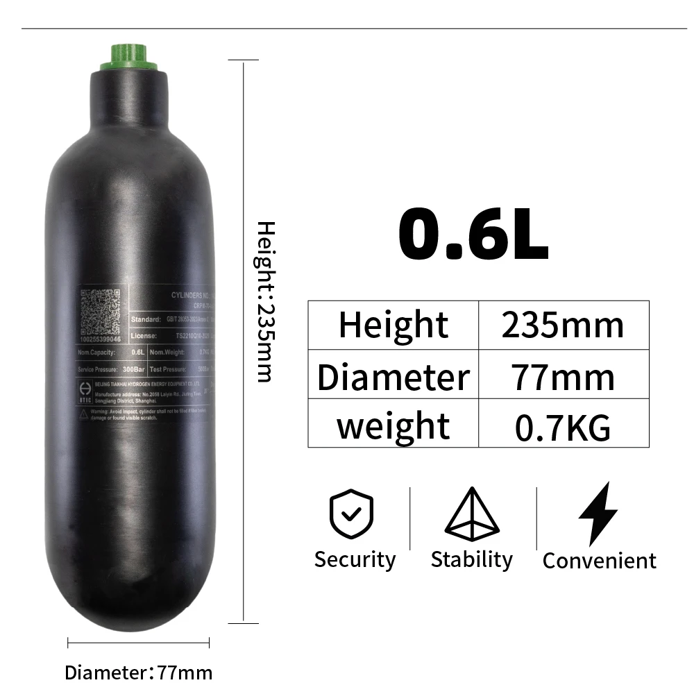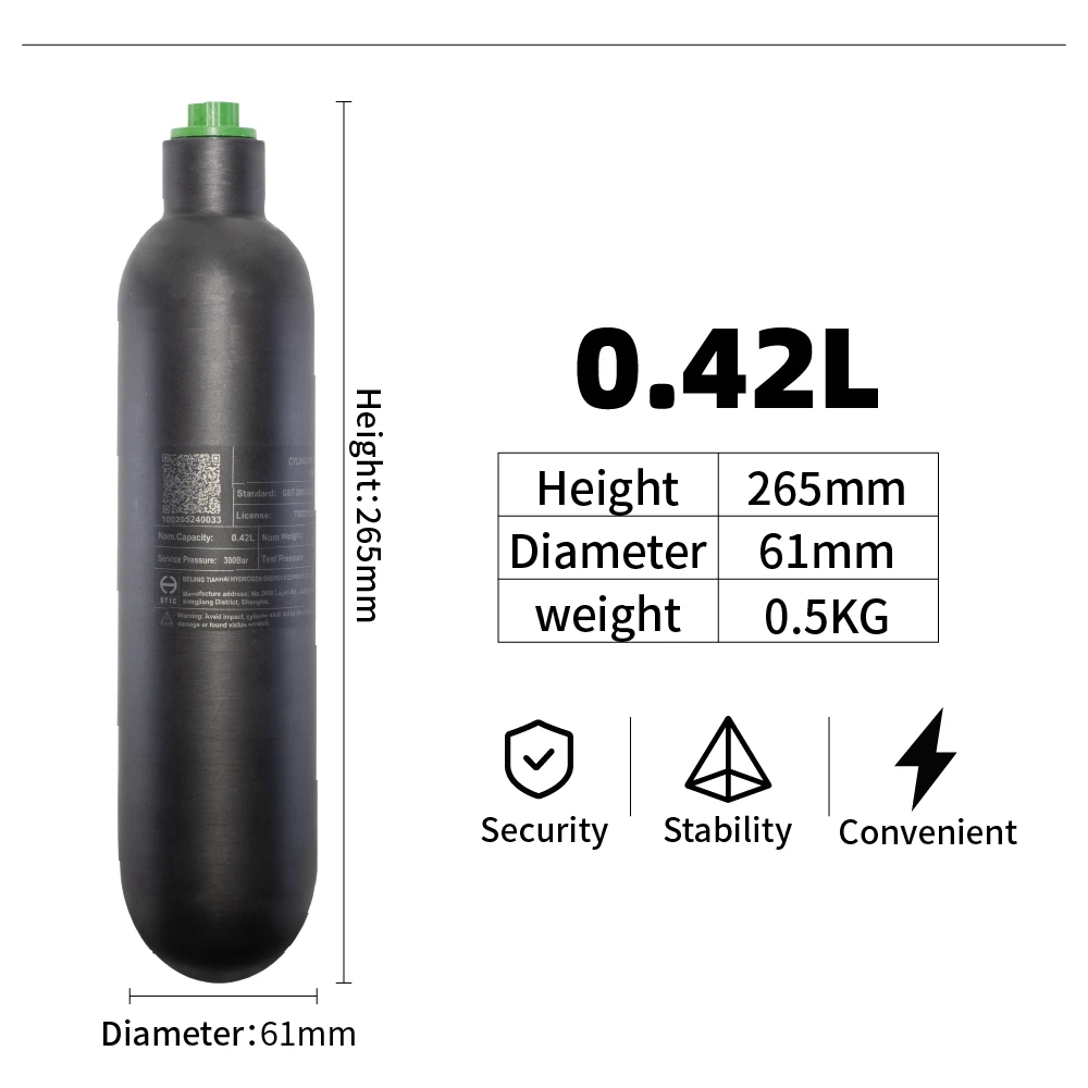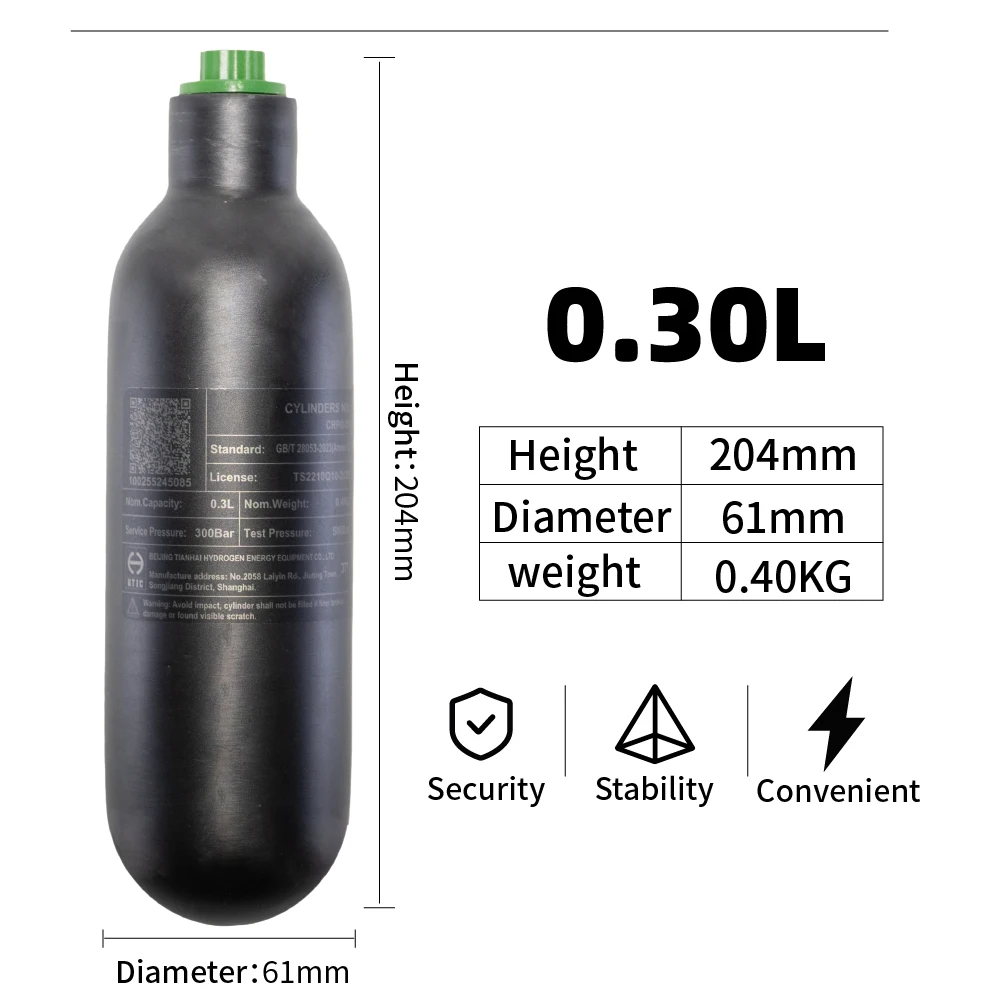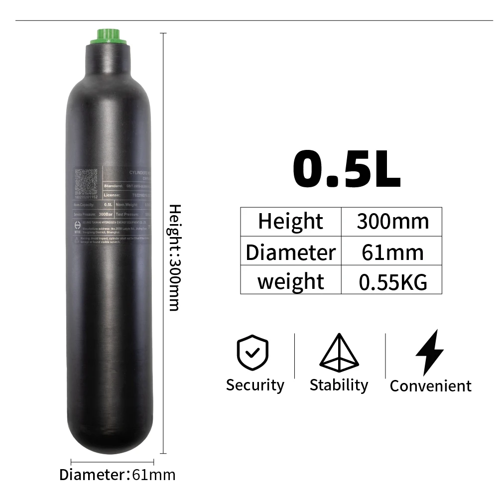 Disponible en tamaños de 0,22 L y 0,5 L/500 cc, este cilindro satisface diversas necesidades, desde tareas pequeñas hasta operaciones prolongadas.