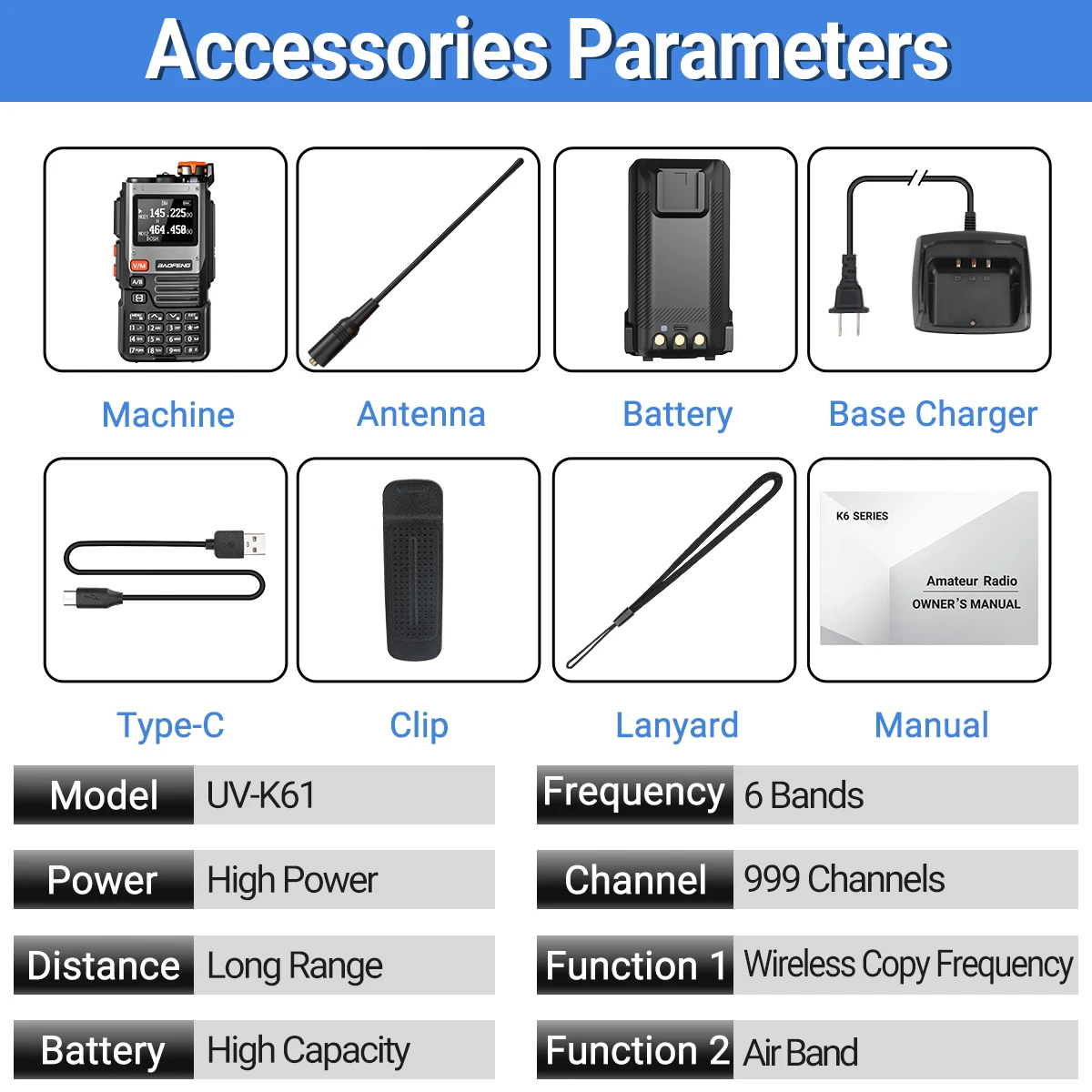 Baofeng UV-K61 Walkie Talkie Banda de aire Frecuencia de copia inalámbrica Cargador tipo C UHF VHF DTMF FM NOAA UV-5R UV-21 PRO V2 Radioaficionado