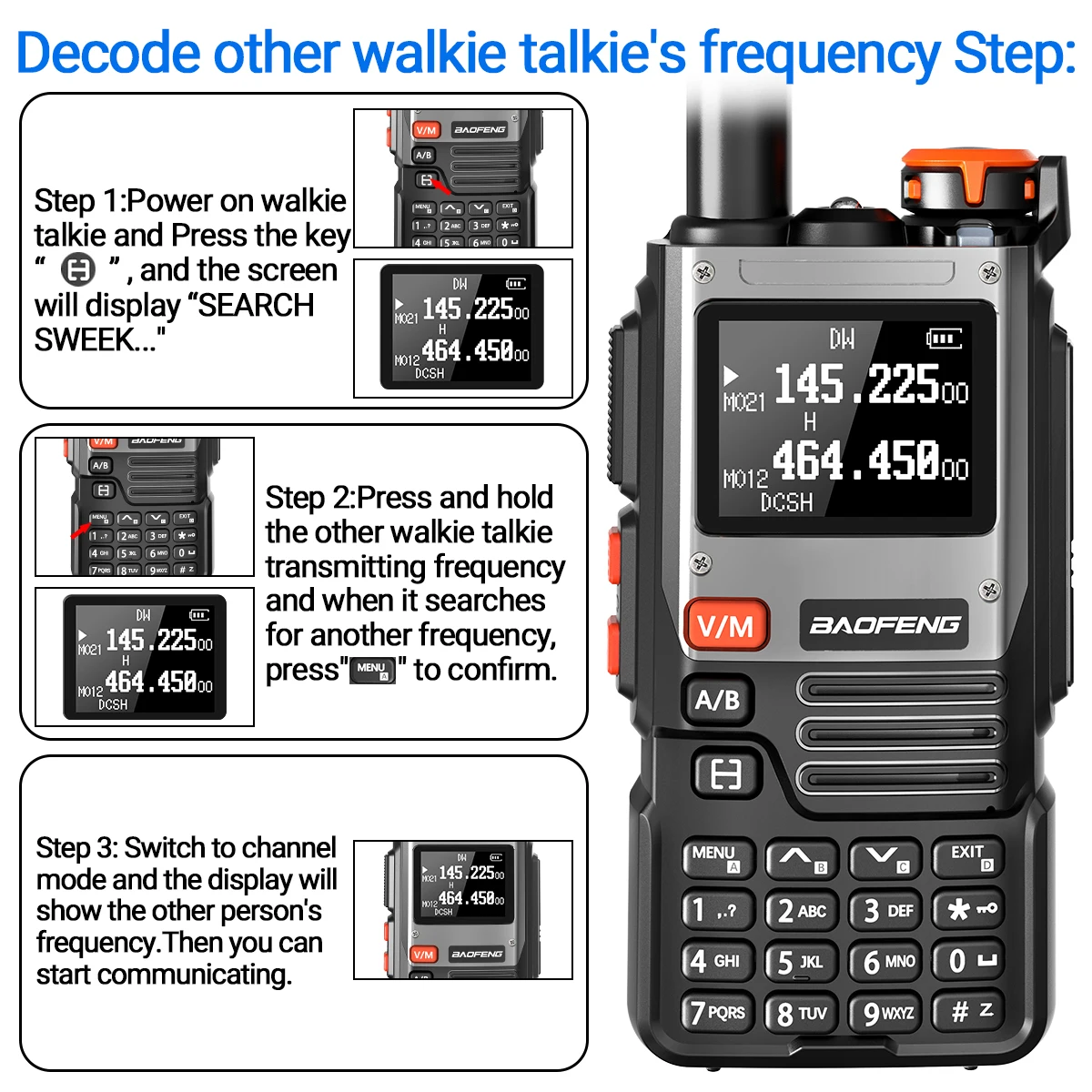 Presione el botón para ingresar a la interfaz "SEARCH".Presione nuevamente y el UV-K6 buscará otra frecuencia de transmisión de radio y un código de privacidad.Finalmente presione el menú para almacenar la frecuencia.Dos walkie-talkies pueden comunicarse normalmente.La comunicación no tiene obstáculos y se rechaza la frecuencia de escritura tradicional.