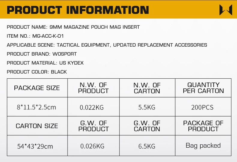 Nombre del producto: Inserto Mag de bolsa para revistas Kydex de 9MM