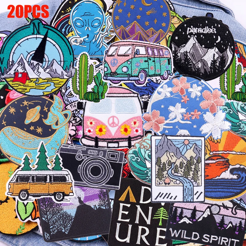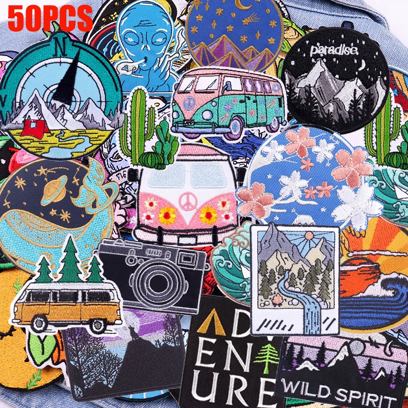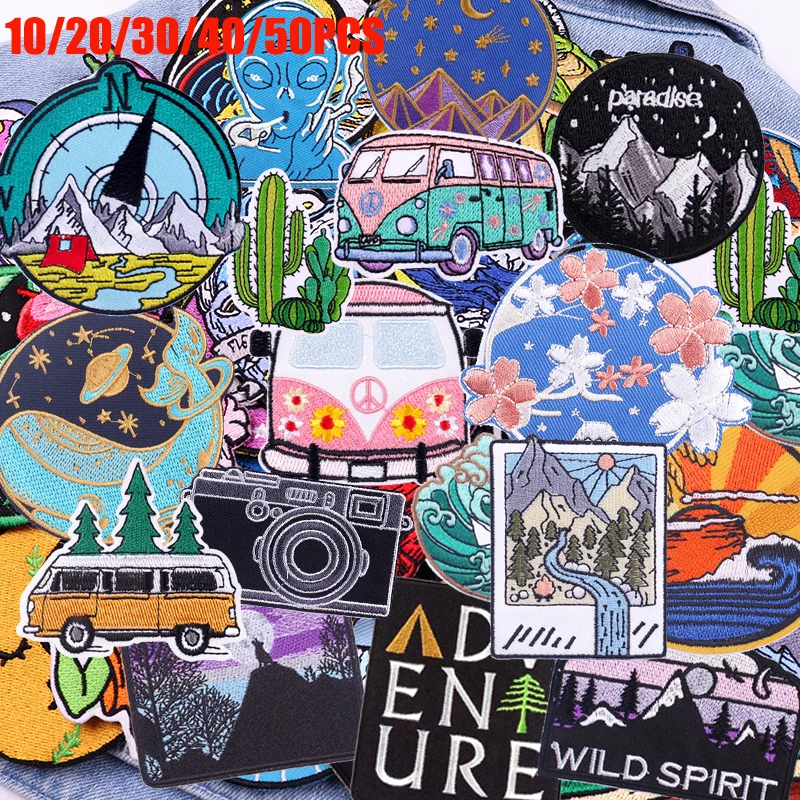 10/20/30/40/50 Uds. Parche mixto al azar para exteriores, parche bordado para acampar en montaña y aventura, parches para planchar, chaquetas, mochila DIY