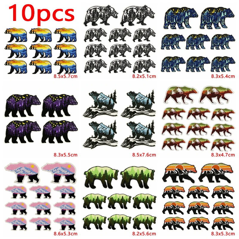 10 Uds., venta al por mayor, parches bordados de osos de animales de dibujos animados, paisaje natural, parches para planchar, sombreros DIY, chaquetas, decoración de insignia de costura