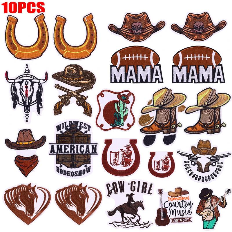 10 unids/set de parches bordados de la serie Western Cowboy, botas, parches de caballo, parches para planchar, chaquetas DIY, mochilas, sombreros, insignias para coser