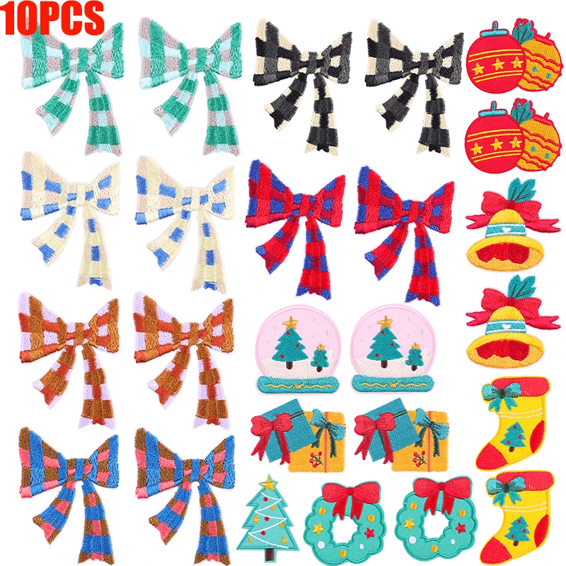 10 unids/set serie navideña parches bordados Santa Claus muñeco de nieve pajarita parche hierro en parches para ropa sombreros chaquetas coser D