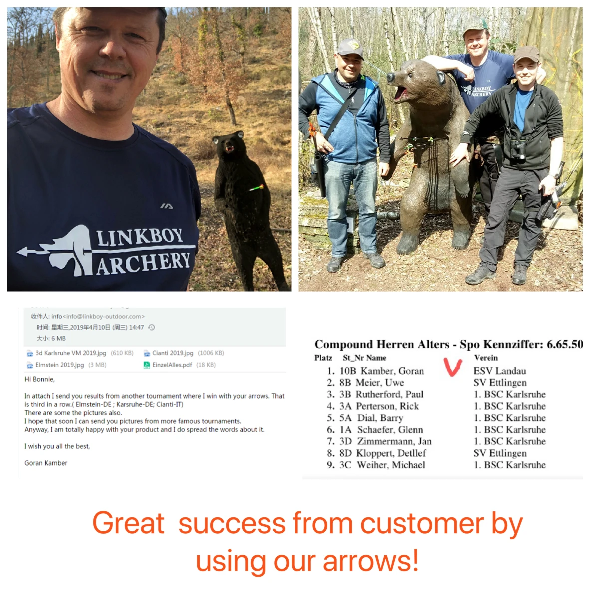 Ningbo LinkBoy deportes al aire libre Co., Ltdestá ubicada en la ciudad de Ningbo, China, y se estableció en 1995. En su agrado, produjo principalmente herrajes metálicos, especialmente puntas de flecha de caza para algunas marcas extranjeras. Ahora es profesional en la fabricación de flechas y accesorios, accesorios para arcos, puntas de flecha de caza y puntas de caza y productos relacionados. Contamos con un estricto sistema de control de calidad y un equipo de ingenieros. Brindamos servicio OEM para muchas marcas famosas en el mundo. Al mismo tiempo, estamos desarrollando nuestra propia marca de "Linkboy Archery", los agentes están vendiendo nuestros productos muy bien expresados en este mercado comercial. Y seguiremos desarrollando nuevos y mejores productos para los compradores.