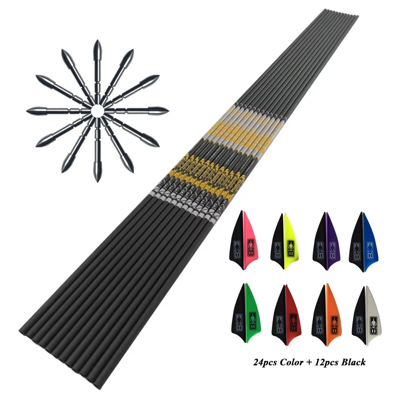Paquete: 12 piezas de eje de flecha + 12 piezas de puntas de flecha 80gr + 36 piezas de paletas(Mensaje de color personalizado, de lo contrario se envía aleatoriamente)