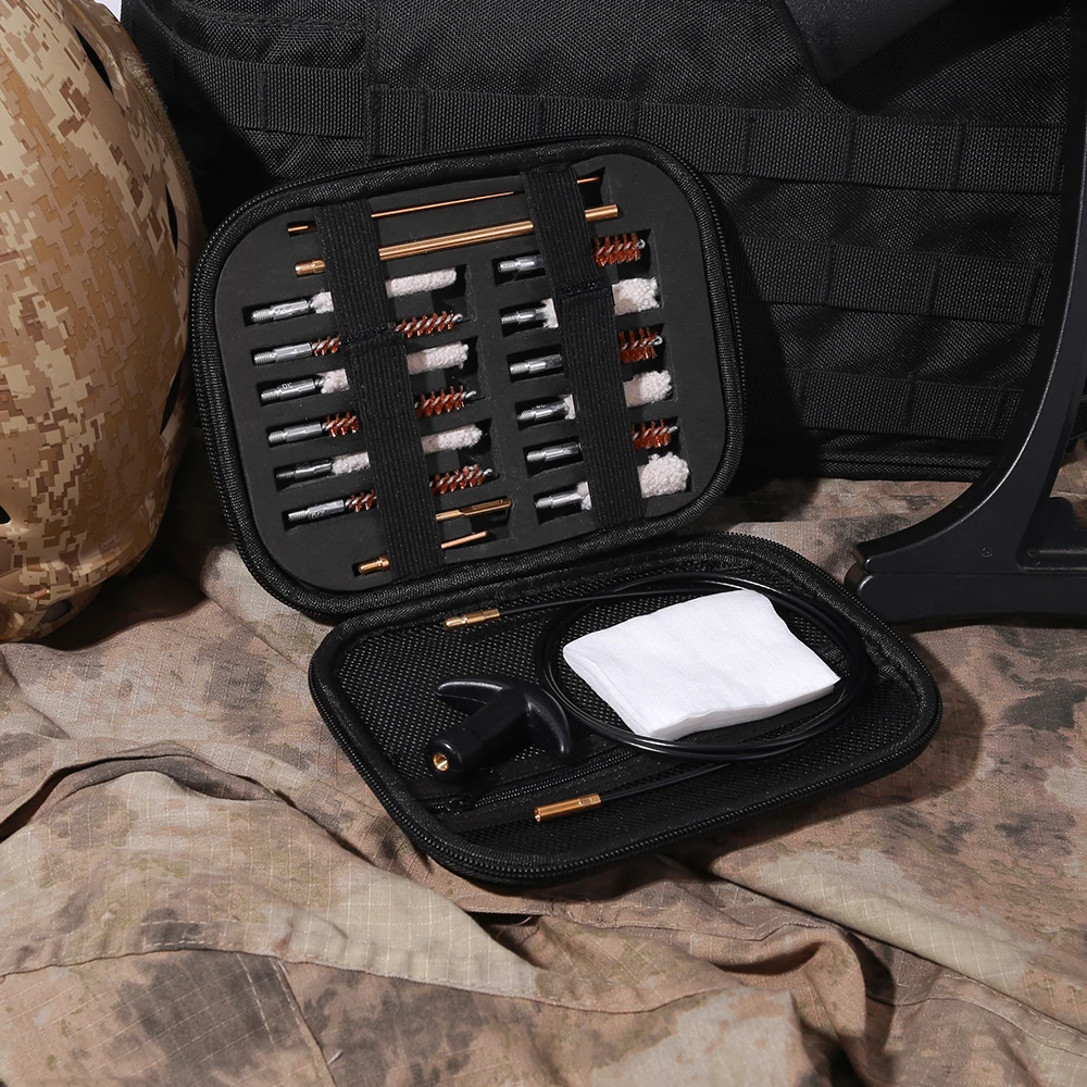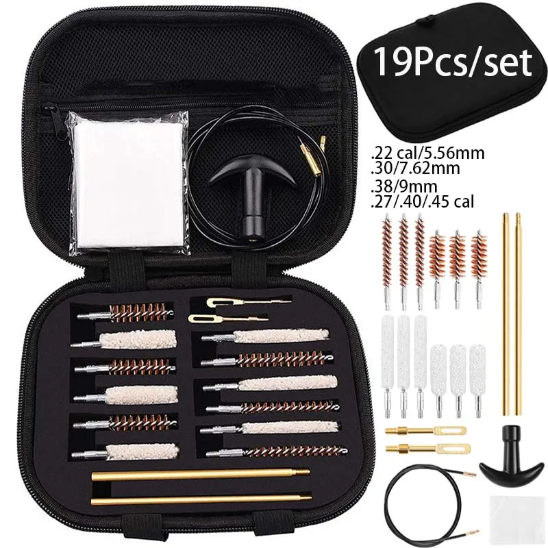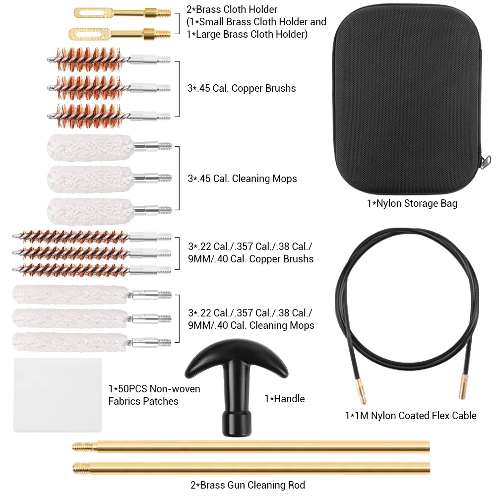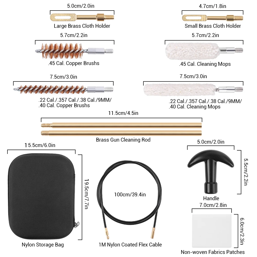 1.【Kit de limpieza de pistola de 19 piezas】Este kit de limpieza de pistola contiene 19 suministros de limpieza cuidadosamente seleccionados, incluidos 1 x.22/.27/.30/.38/.40/.Pincel de bronce fósforo de 45 cal, 1 x.22/.27/.30/.38/.40/.Cepillo para fregona de 45 cal, 1 x.22/.30 puntas ranuradas de latón, 2 varillas de latón, 1 mango en T, 1 cable flexible recubierto de nailon, 50 parches de limpieza y un estuche de transporte.Este kit contiene casi todas las herramientas que necesita para la limpieza de pistolas y es un kit inicial ideal.