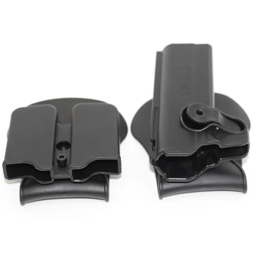 CARACTERÍSTICAS: Fabricado en ABS rígido. Viene con pistola y funda de doble cargador. Color camuflaje de transferencia de agua. Cómodo ajuste contorneado. Retención sin tiempo para desactivarse. Se encuentra donde su dedo gatillo normalmente se desliza en "The Ready". Simplemente presione la palanca y retire el arma de fuego. Gira 360 grados para cada aplicación (pequeño respaldo, tracción cruzada), se ajusta con un simple cabezal Phillips. Pala que le permite usar la funda con o sin cinturón y permite ponerse y quitarse fácilmente la funda. La paleta se ajusta a diferentes tamaños de cinturón.(hasta 57 mm o 2 1/4") Peso ligero y duradero. Permite dibujar más rápido y recubrir fácilmente.