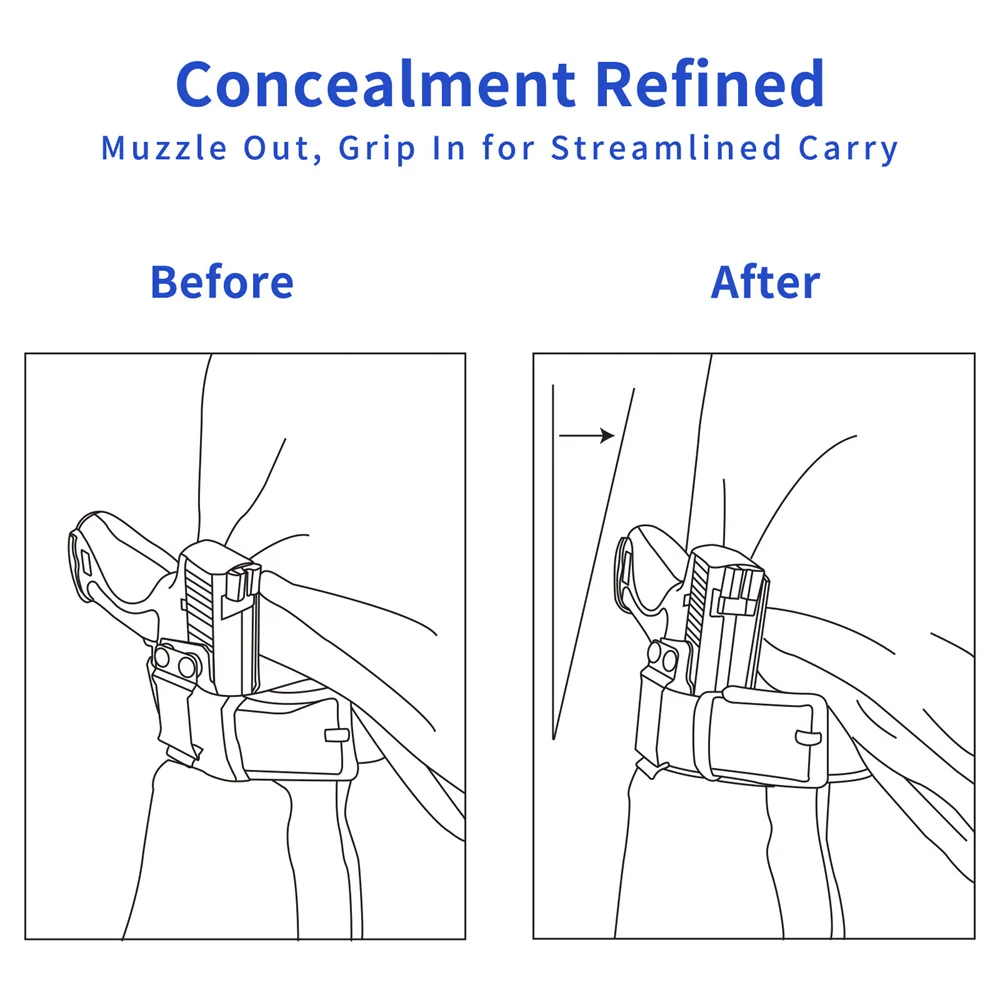 Su diseño cónico inclina el agarre de la pistola hacia adentro hacia el cuerpo, reduciendo significativamente la impresión (contornos visibles) debajo de la ropa para una ocultación más profunda.