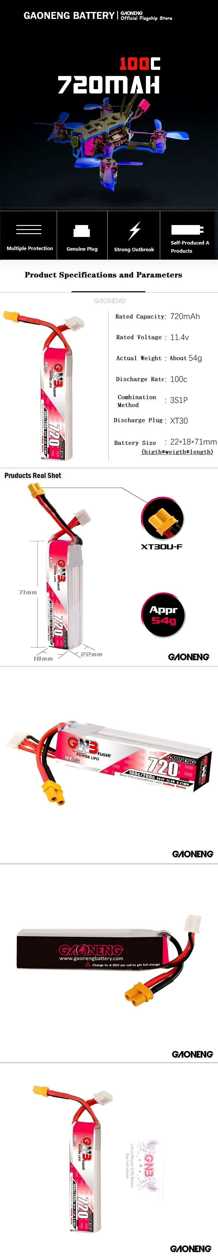 2/4 Uds GNB 3S 11,4 V 720mAh 100C batería Lipo XT30 enchufe para RC Dron de carreras con visión en primera persona Kit de marco Tinywhoop piezas de repuesto