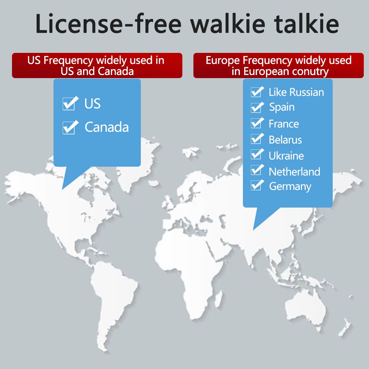 ▶PMR 446MHz: para países europeos como Rusia, España, Francia, Italia, Polonia Países Bajos, Ucrania, Bielorrusia, Inglaterra, Alemania, etc.