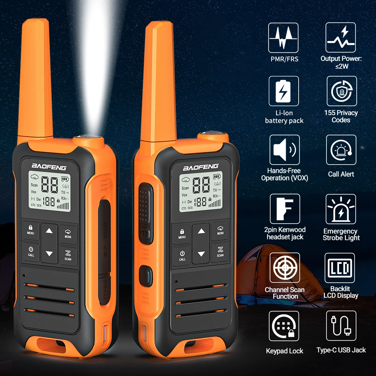 👍【 Multi-function】La linterna grande puede satisfacer su iluminación nocturna, la radio de dos vías FRS portátil tiene alarma meteorológica, que es adecuada para su viaje al aire libre, y también tiene 16 canales (PMR) / 22 canales (FRS), modo de monitoreo dual, escaneo de canales, 155 códigos de privacidad, función de llamada y 8 opciones de tono de llamada, Función manos libres VOX y calidad de audio HD, así como bloqueo de teclado, pantalla LCD retroiluminada, alerta audible de batería baja, Conector de auriculares Kenwood de 2 pines, conector USB tipo C para cargar.