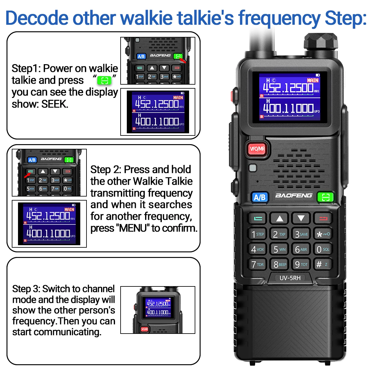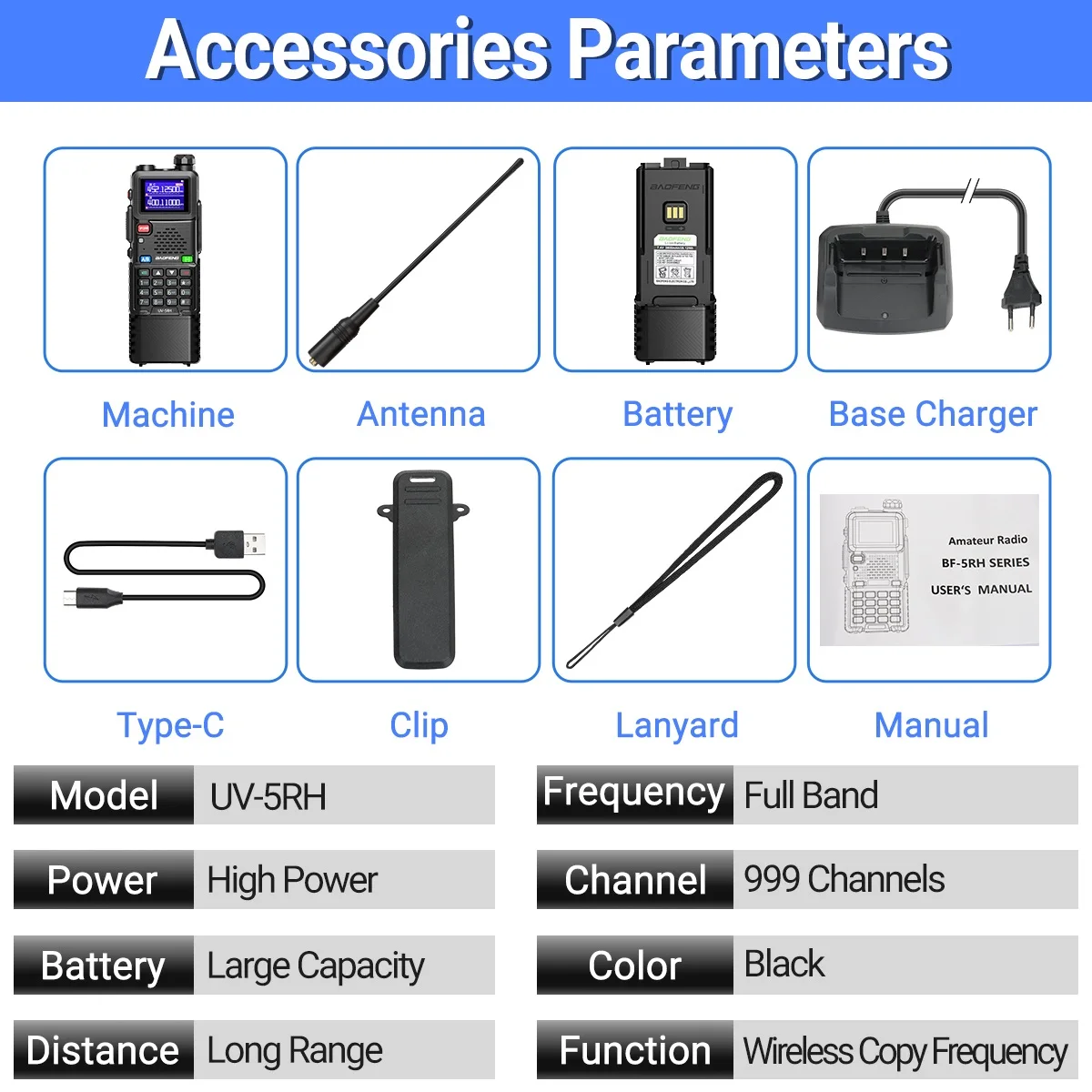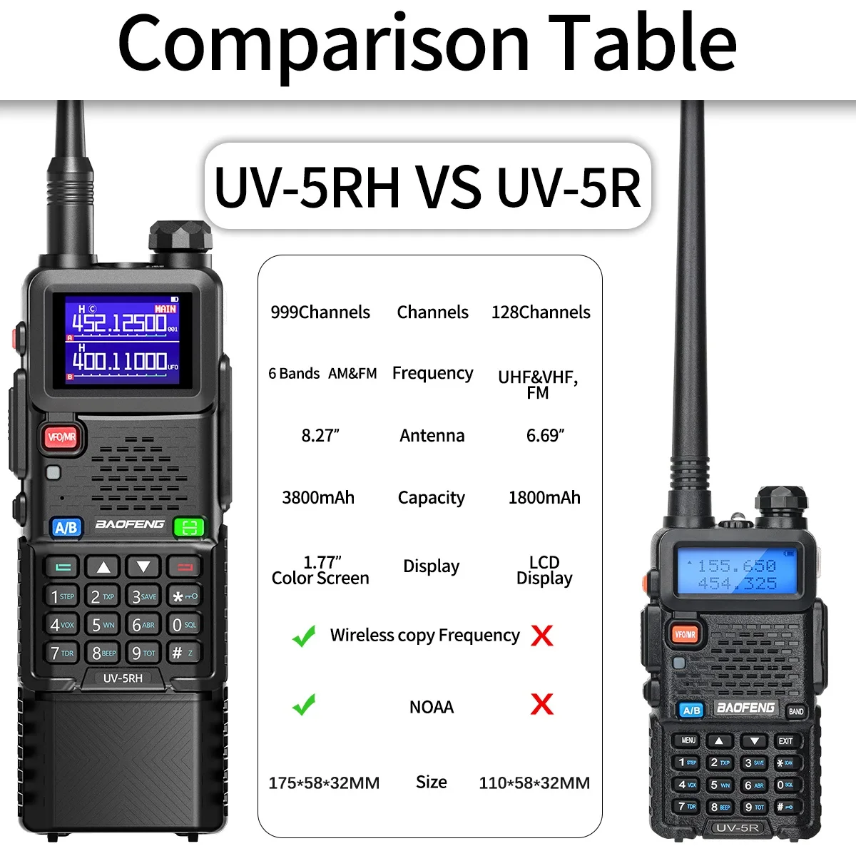 UV-5RH es una radioaficionada profesional, verdadera potencia de 10 W, conmutación de tres potencias alta/media/baja.Hasta 999 canales. Pantalla a color de 1,77 pulgadas.