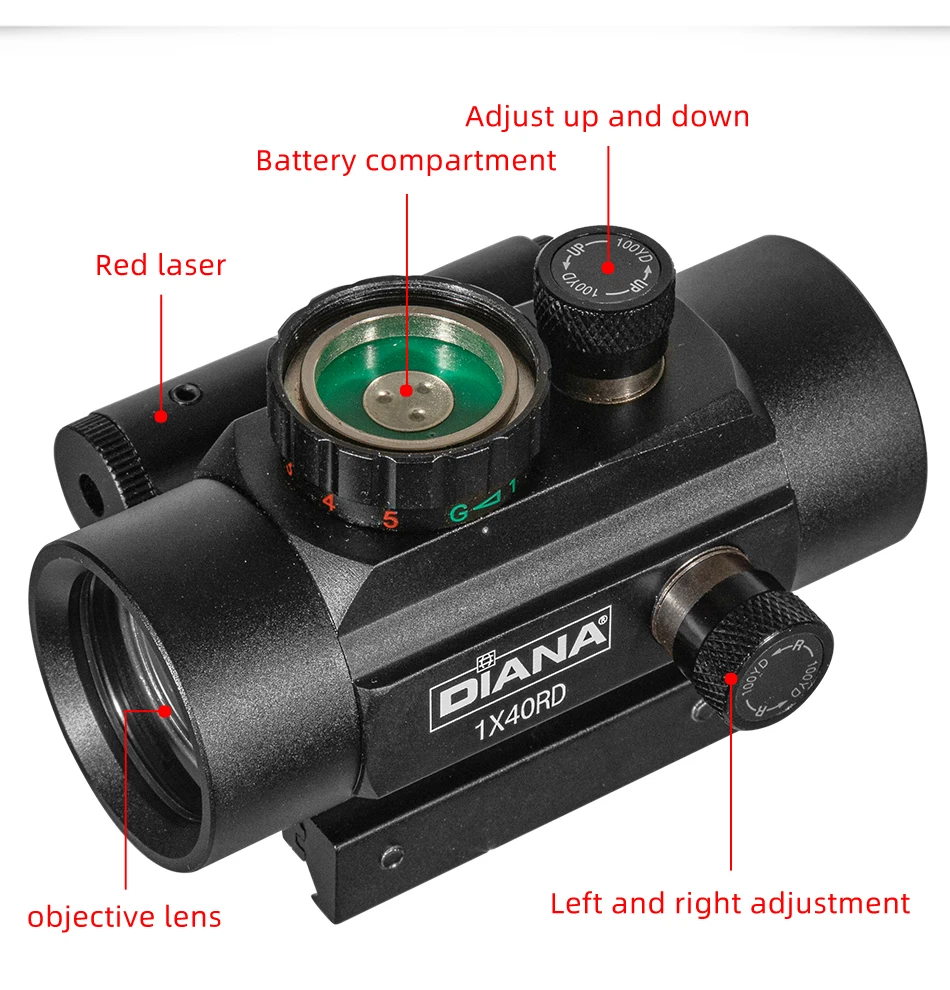 2025 DIANA 1x40 punto rojo con láser rojo punto rojo verde mira telescópica Corss mira táctica ajuste 11/20mm riel Rifle mira para caza