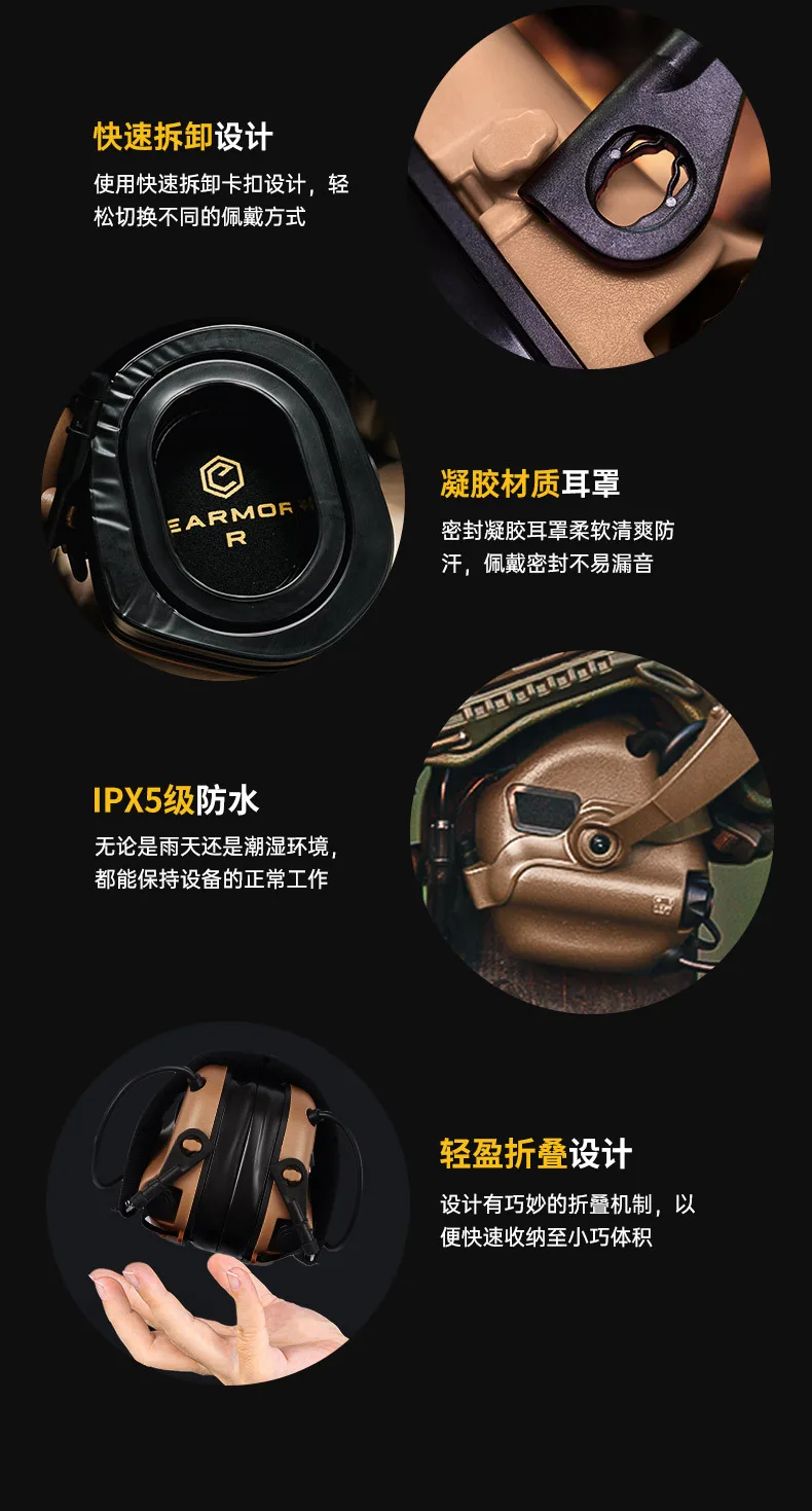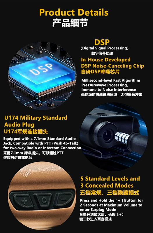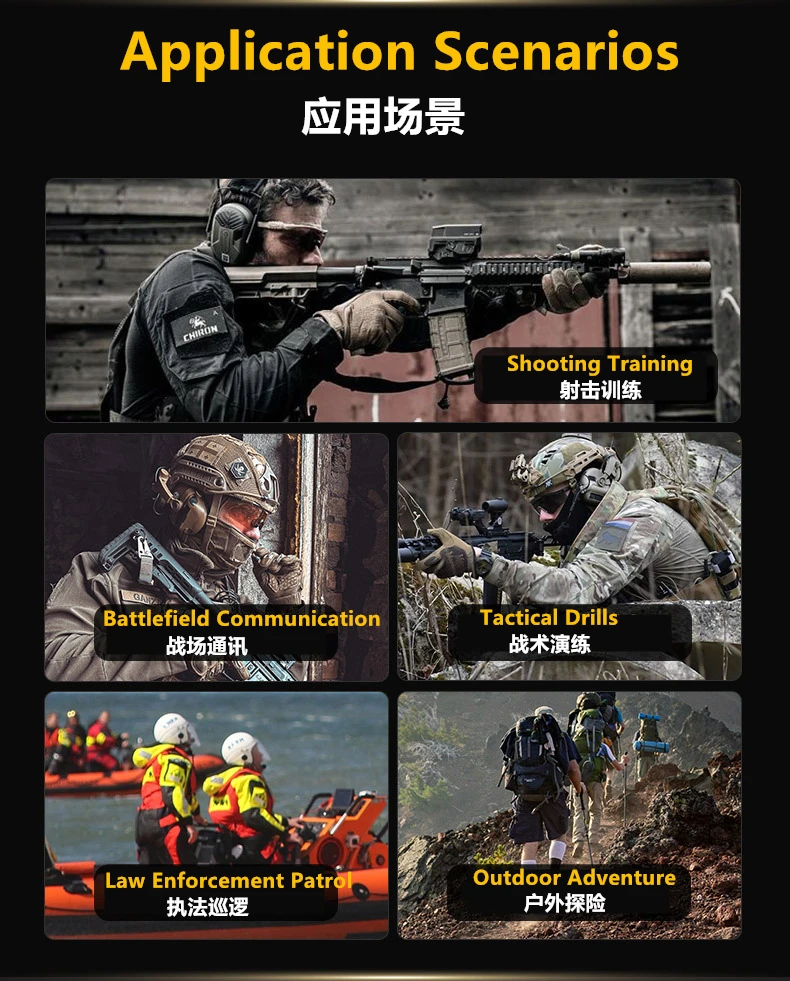 Environmental perception5-level volume adjustment, allowing for better customization to suit different environmental needs. Enhance perception of speech, motion, aircraft, vehicles, weapon operation, and shooting to not only protect hearing but also improve environmental awareness.