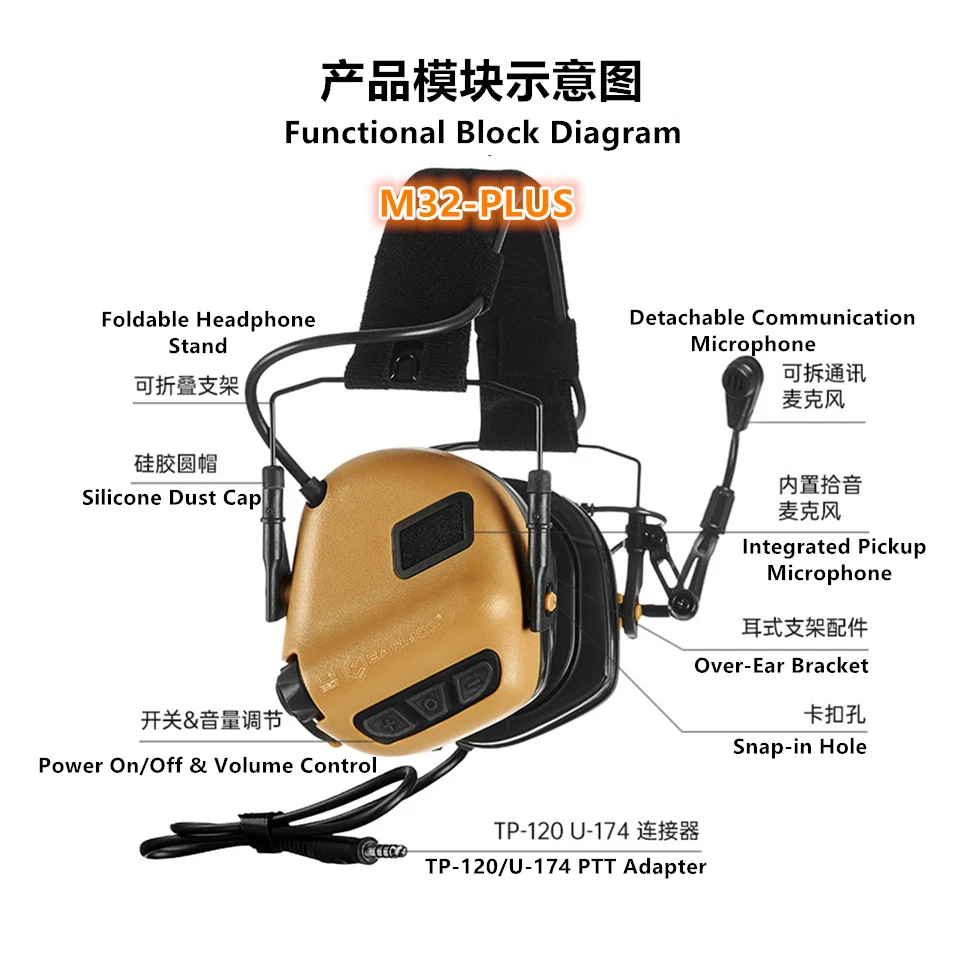 EARMOR M32 PLUS is a digital noise-canceling headset designed to protect hearing in daily shooting training. It can suppress noise exceeding 82dB, such as explosions or gunfire, while enhancing ambient sounds. Enhance perception of speech, motion, aircraft, vehicles, weapon operation, and shooting to not only protect hearing but also improve environmental awareness. The modular design allows adaptation to different suspension systems. Gel ear pads seal around ears to block noise and maintain long term wear. The EMI system effectively filters electromagnetic interference from other electronic devices. The M32 PLUS features detachable microphone with adjustable angles, TP120 Kevlar cable and U-174 military standard connector (NATO). It connects to radio devices for communication through the EARMOR® M51/52 PTT (or other NATO standard PTT).