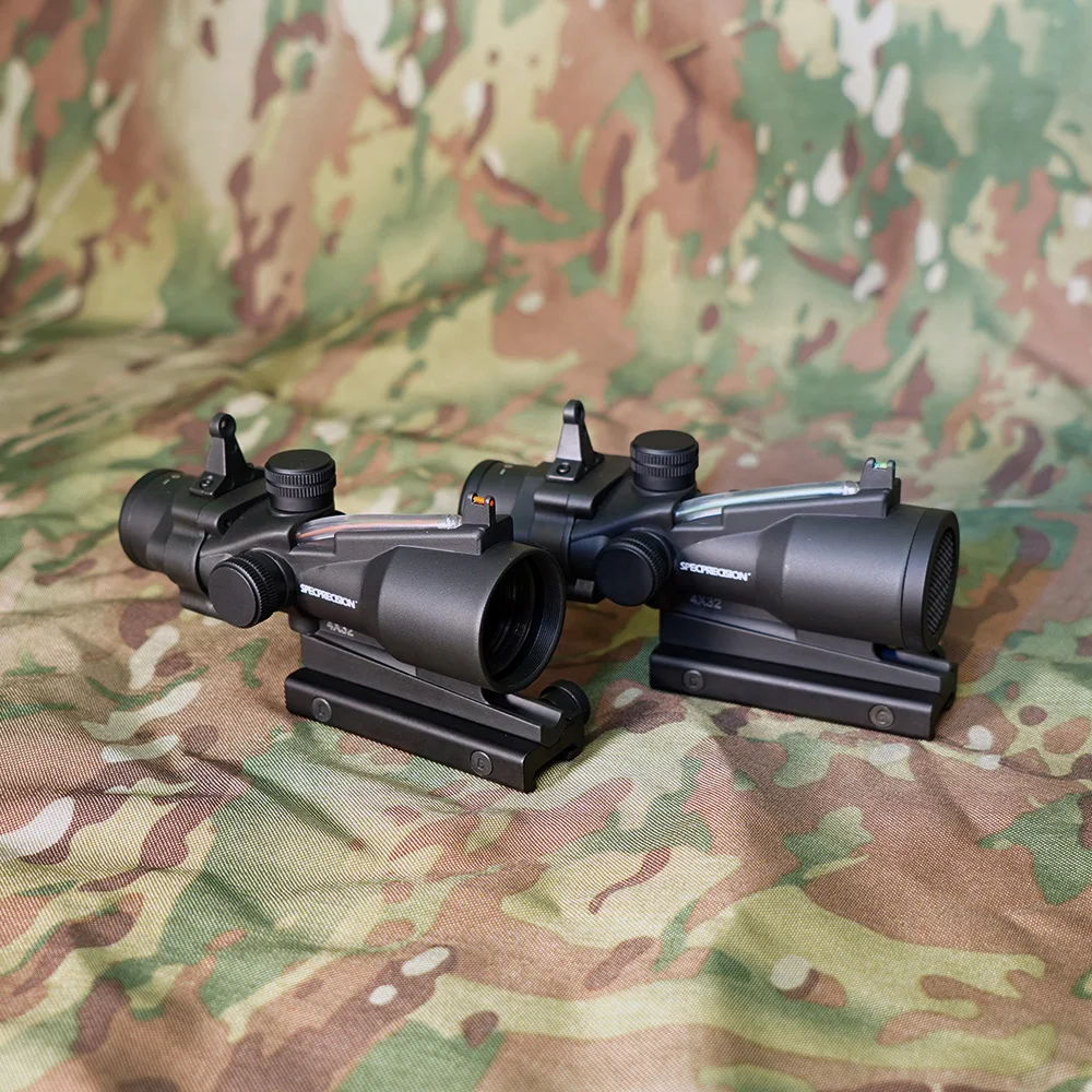 El visor de rifle de retícula cruzada de fibra óptica 4X32 SPECPRECISION es un visor de prisma iluminado con fibra óptica verdadera, que ofrece una opción entre el retícula de punto de herradura, el retícula Chevron y el retícula de crosshair.