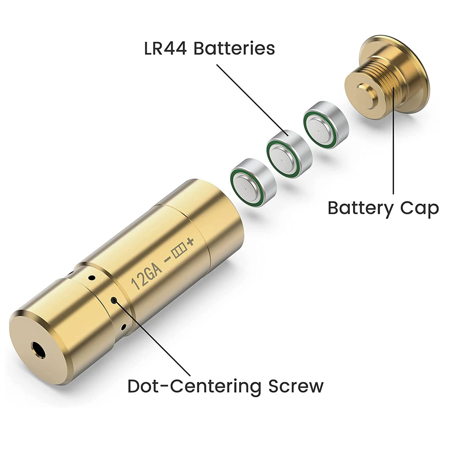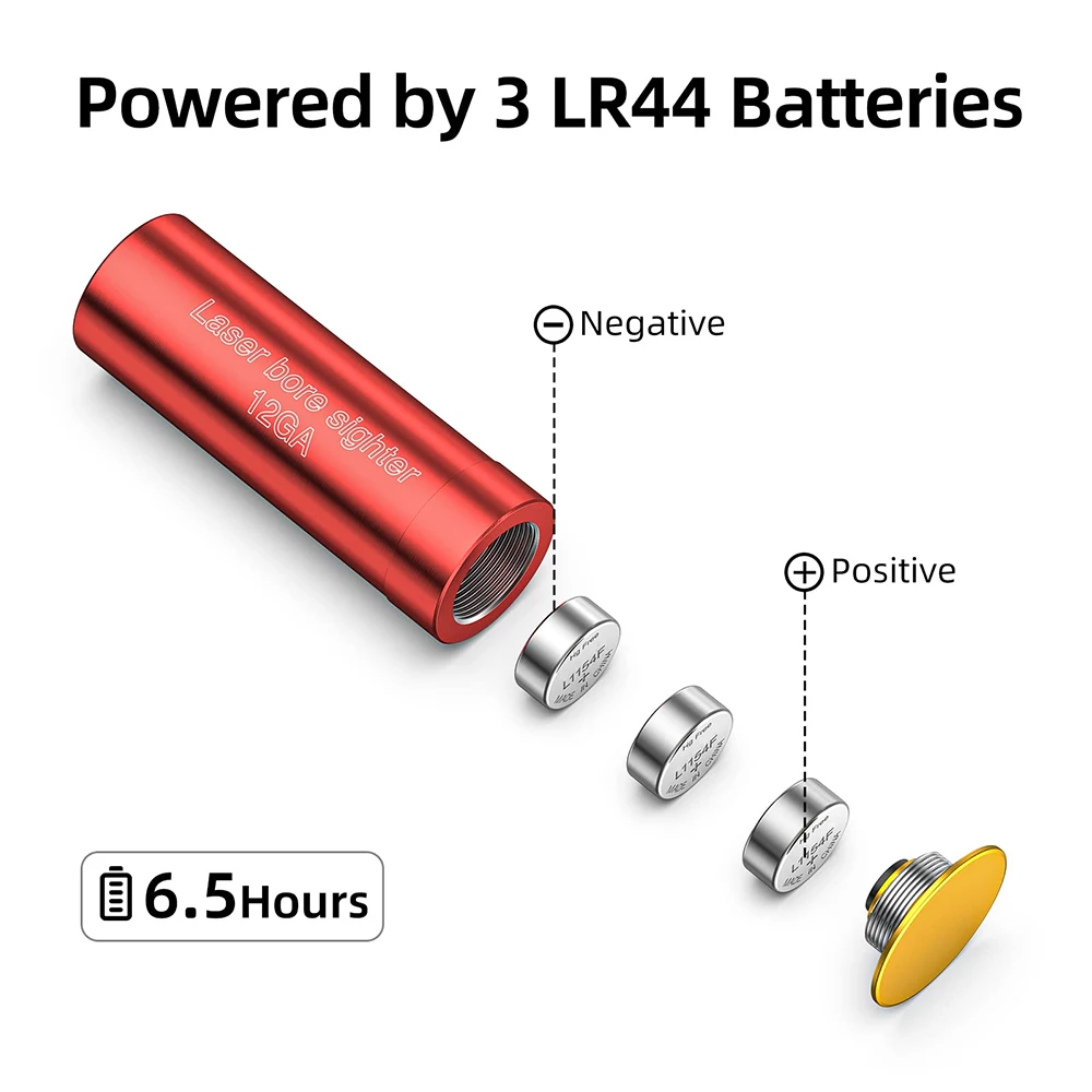 1. 【Boresighter de larga duración】 La mira de diámetro de calibre 20/12 utiliza 3 baterías a la vez.El LR44 actualizado durará hasta 6,5 horas por juego.
