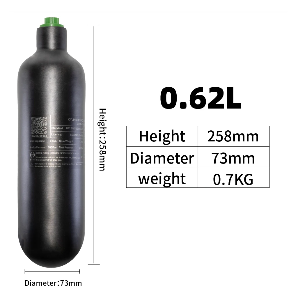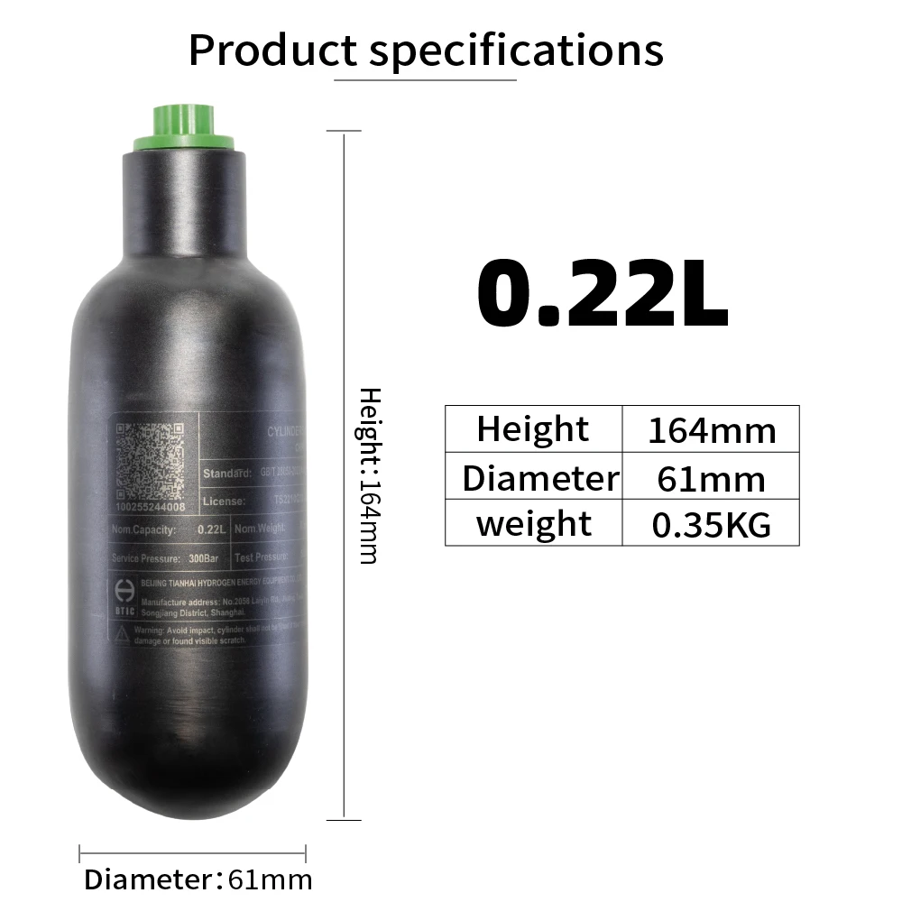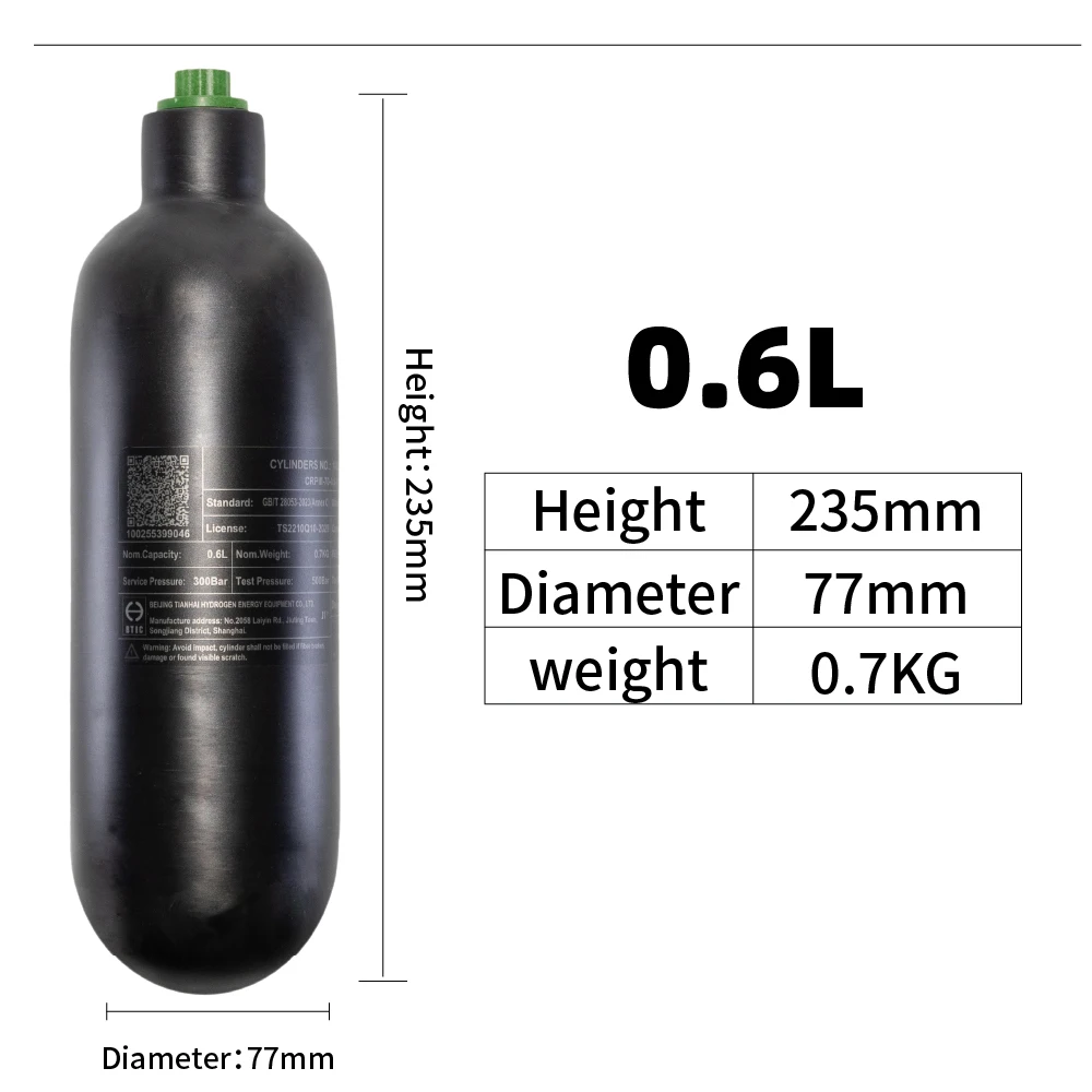 220cc/360cc/500cc 0.3L,0.42L,0.6LHPA tanque de gas de alta presión de fibra de carbono, cilindro de gas de respiración de buceo 4500Psi, 300Bar, M18 * 1,5
