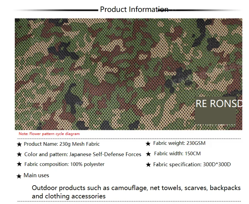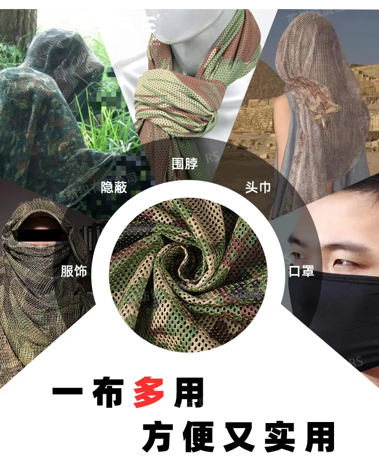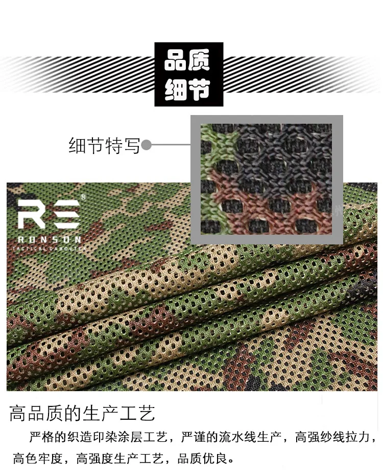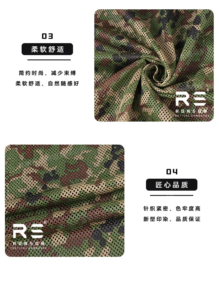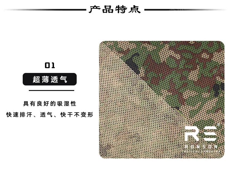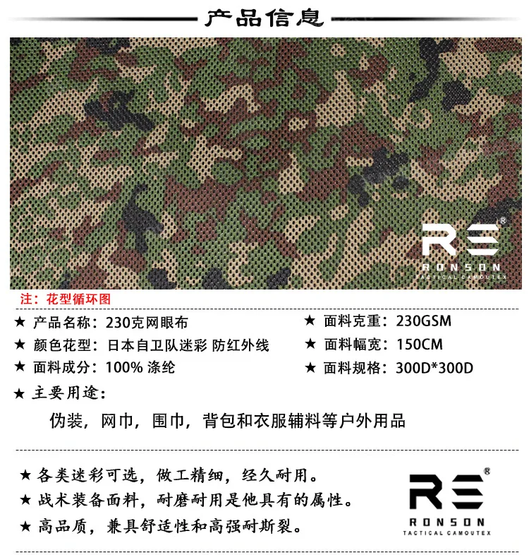 Usos principales: Camuflaje, toallas de red, bufandas, mochilas y complementos de vestir y otros productos para exteriores.