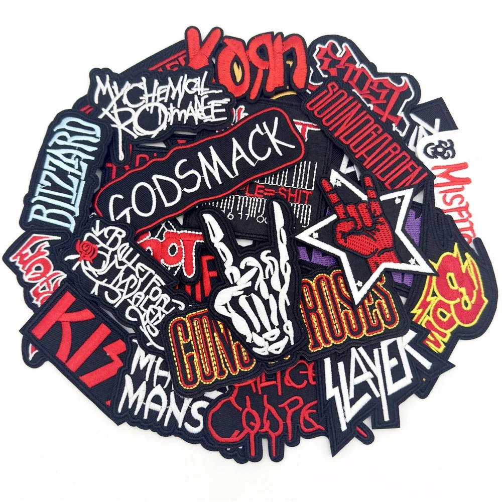 25 unids/lote parches de banda de roca para ropa rayas bordadas parches de hierro insignias musicales pegatinas de ropa Diy chaleco de costura chaqueta