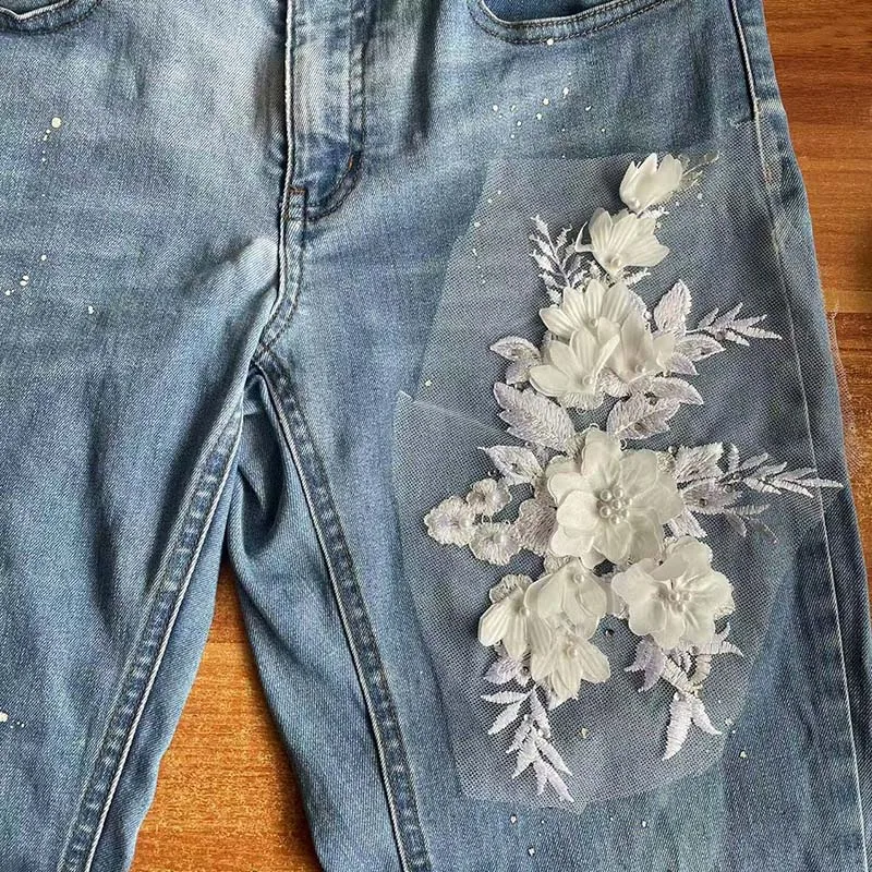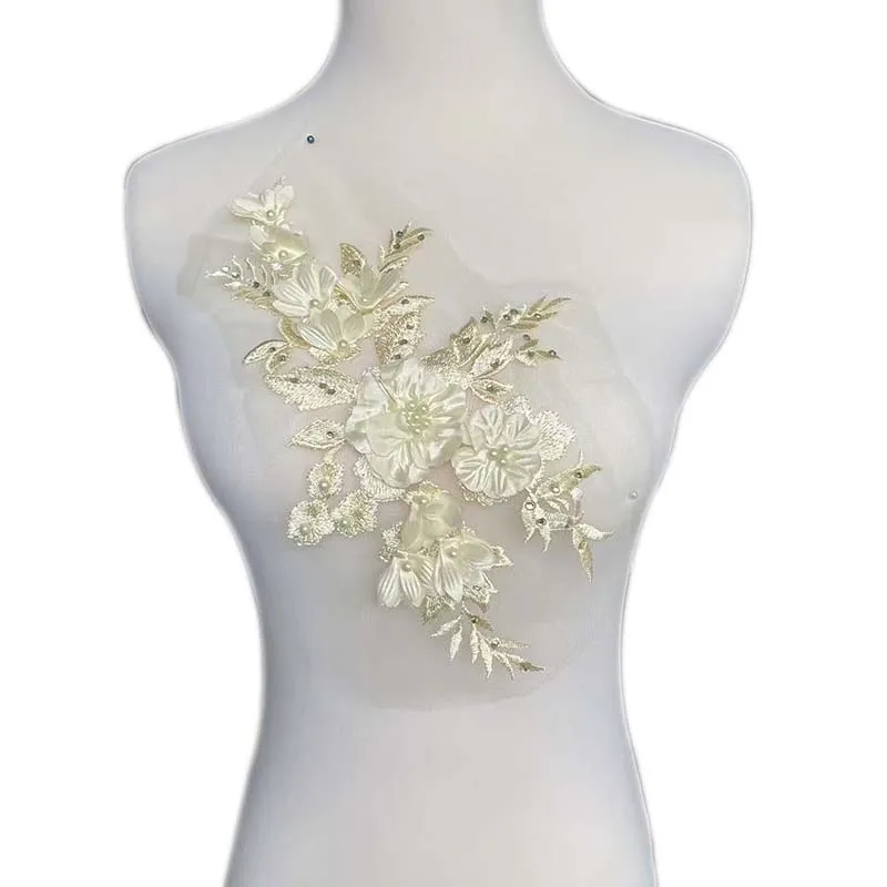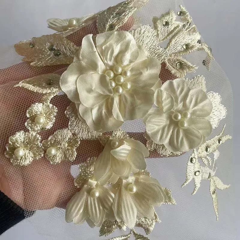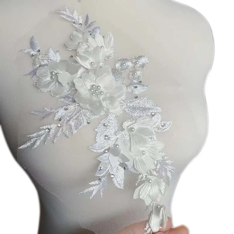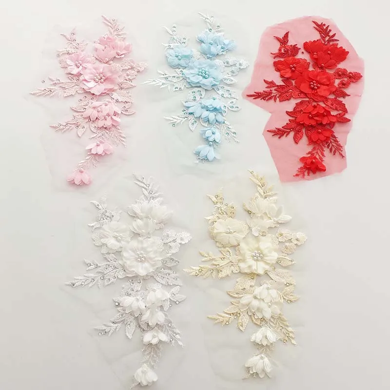 26,5*13CM 3D flor encaje apliques con cuentas suministros de costura, telas bordado Floral de diamantes de imitación coser en parches para vestido, ropa