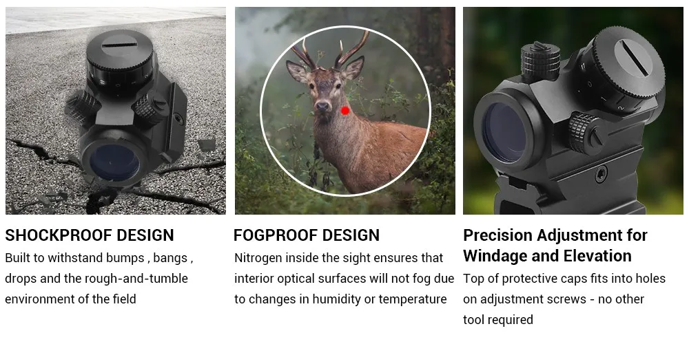 The waterproof optics are O-ring sealed and will stay dry even go 30cm deep for 30 minutes. The high shock-resistant design makes the sight can withstand bumps, bangs, drops and the rough-and-tumble environment of the field. Nitrogen inside the sight ensures that interior optical surfaces will not fog due to changes in humidity or temperature.