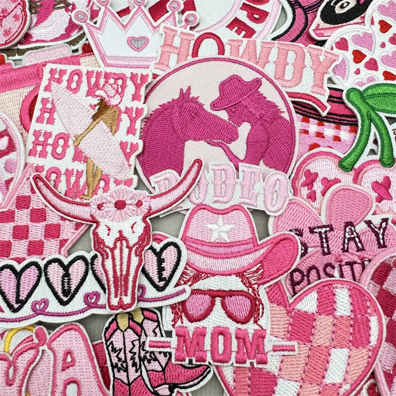 30 unids/lote parches bordados de cereza de dibujos animados para ropa parche de letras de corazón rosa parches de hierro en pegatinas de apliques de ropa