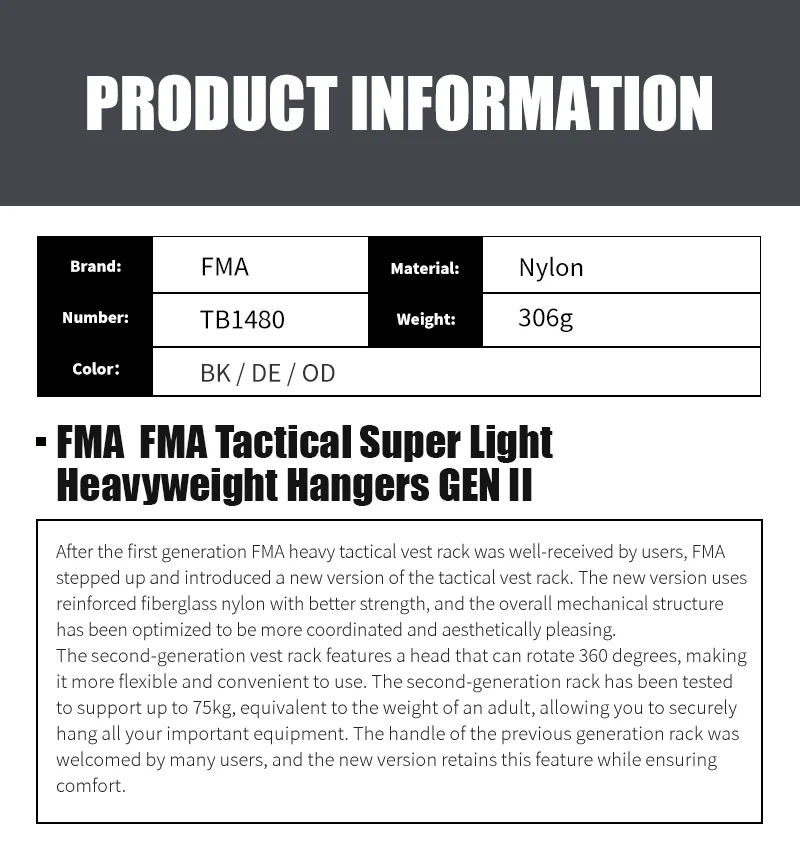El colgador de chaleco liviano y resistente de segunda generación puede girar 360 grados por 75 kilogramos,con una capacidad de carga ultraligeraMaterial: nailonEl paquete incluye:1 * colgador de chaleco (no incluye otros)