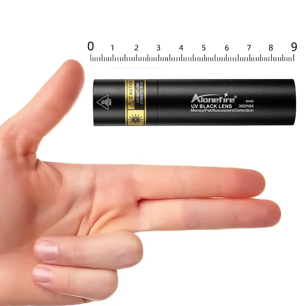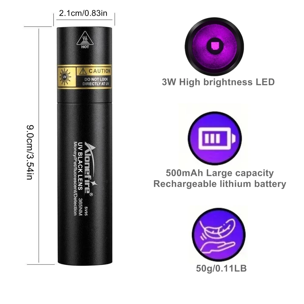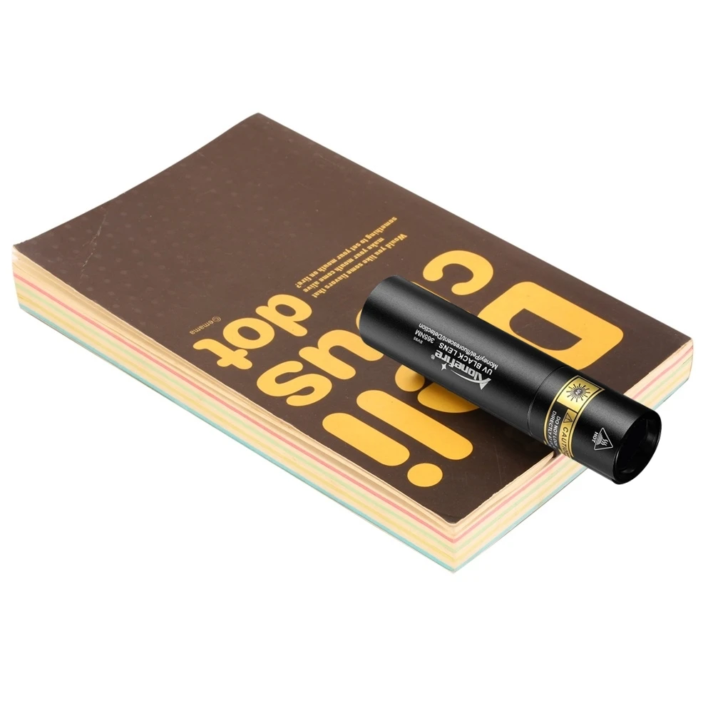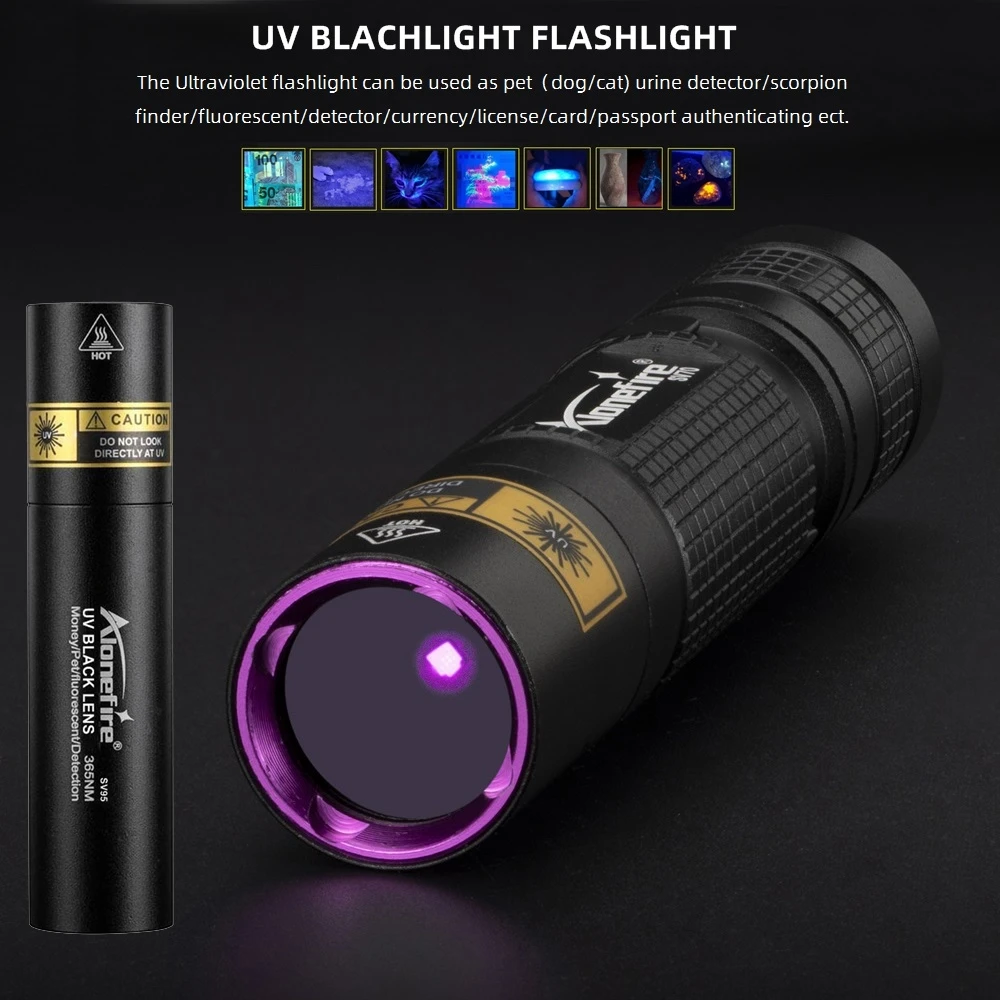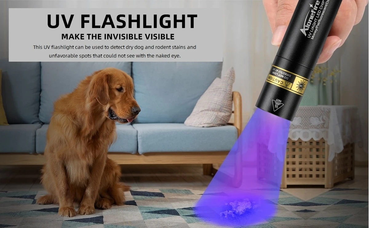 La linterna ultravioleta se puede utilizar como detector de orina para mascotas (perros/gatos)/buscador de escorpiones/fluorescente/detector/moneda/licenza/tarjeta/autenticación de pasaporte/manchas de aceite/detector de fugas/oro/identificación antigua/curado con pegamento UV/etc.