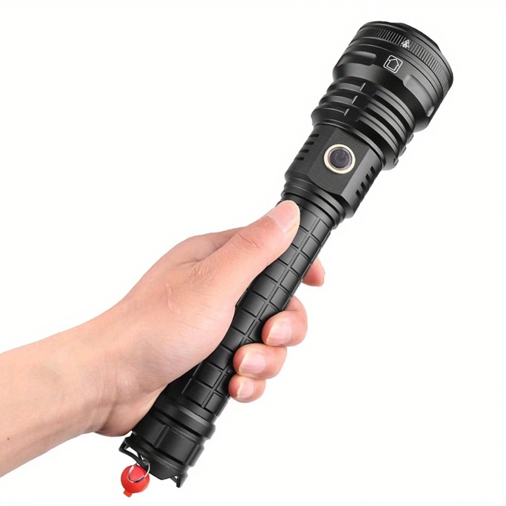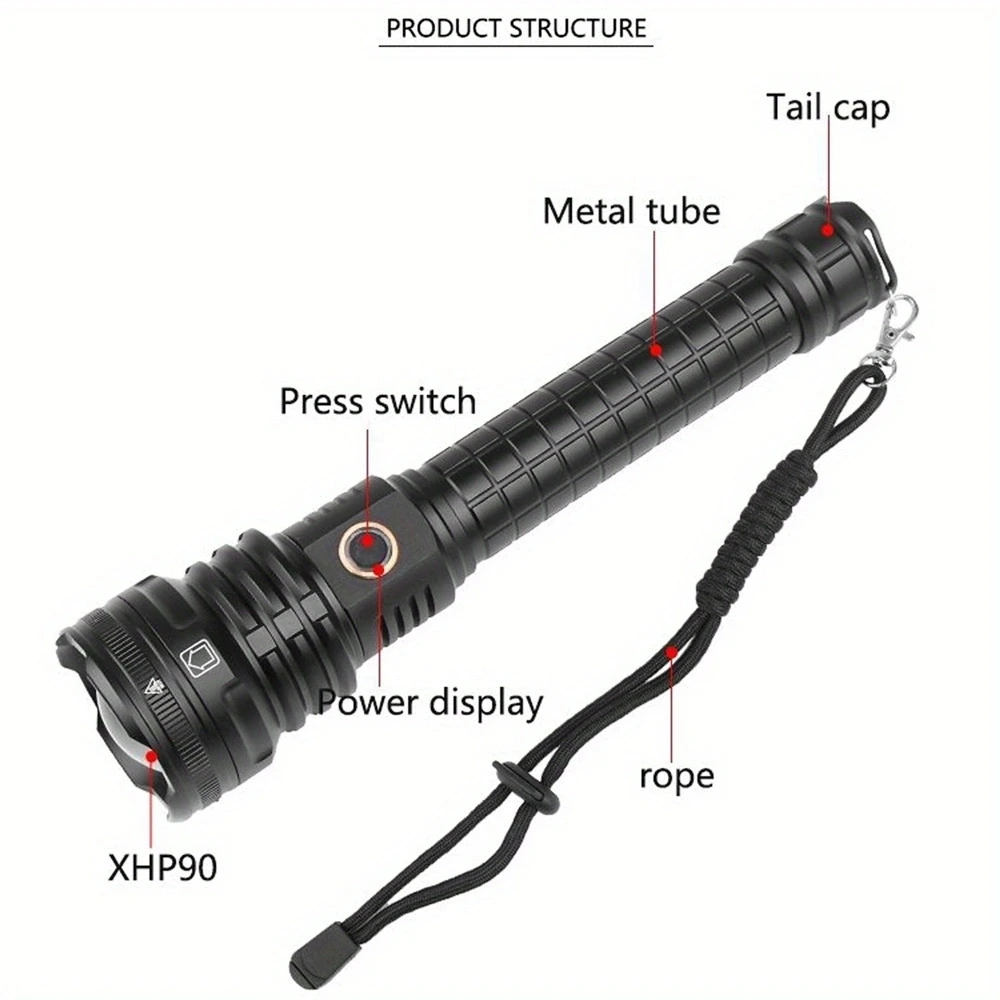 Especificación: 1.Nombre de marca: AloneFire 2.Nombre del modelo: H49 3.LED: LED XHP90 4.5 modos: Alto / Medio / Bajo / Estroboscópico / SOS 5.Color de la linterna: Negro 6.Interruptor: interruptor de botón central 7.Material: aleación de aluminio 8.Dimensiones: 260 mm/10,24 pulgadas x 60 mm/2,36 pulgadas x 35 mm/1,38 pulgadas 9.Peso (g): alrededor de 450 g/0,99 lb 10.Distancia de iluminación: alrededor de 200-500 metros 11.Batería: Para 2 baterías 18650 / 2 x 26650 12.Función: Micro USB recargable/salida: 5V=1-2A