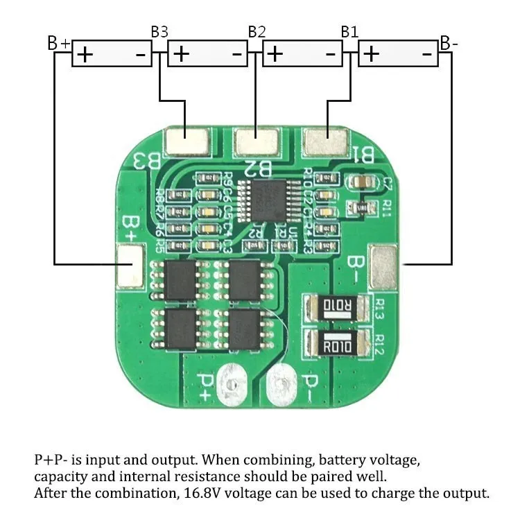 14,8 V (voltaje nominal de batería Li-ion 18650 o Li-ion)16,8 V (voltaje de carga completa de la batería de iones de litio)14,4 V (voltaje nominal del paquete de baterías Lipo)Propiedades:Rango de voltaje de sobrecarga: 4,25-4,35 v ± 0,05 vRango de voltaje de sobredescarga: 2,3-3,0 v ± 0,05 vCorriente de trabajo superior: 10ATemperatura de funcionamiento: -40-- +50℃Corriente instantánea del límite superior: 20ACondiciones de almacenamiento: -40-- +80℃Corriente estática: menos de 30uAVida efectiva: más de 50.000 horasResistencia interna: menos de 100mΩProtección contra cortocircuitos: Puede protegerse y debe cargarse para su recuperación.Tensión de carga 16,8 V-17 VTamaño: 35*35*3,6mmCaracterísticas: