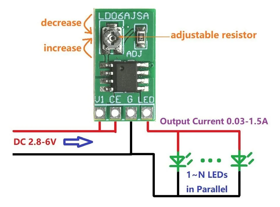 1.Voltaje de funcionamiento: CC 2,8-6 V (para controlador LED 3 V 3,3 V 4,7 V 4,5 V 5 V 6 V)