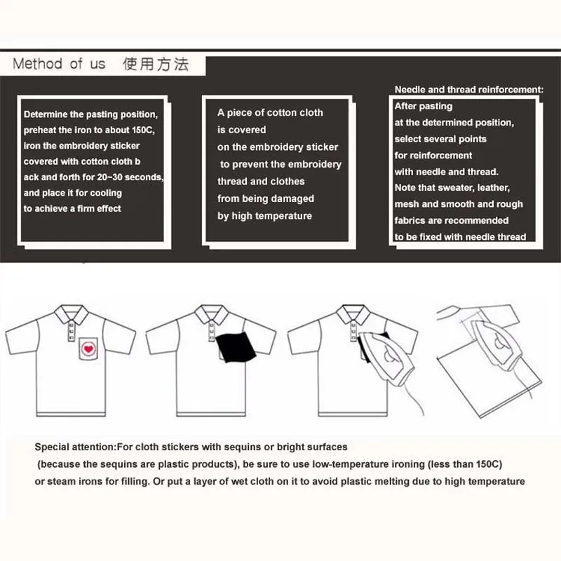 Consejos: 1.Se puede pegar directamente en ropa, pantalones, bolsos, sombreros, etc., muy conveniente 2.Sin embargo, para artículos que deben lavarse con frecuencia, se recomienda usar plancha y luego fijarlos con aguja. y hilo. Tendrá un mejor efecto, no se caerá fácilmente.