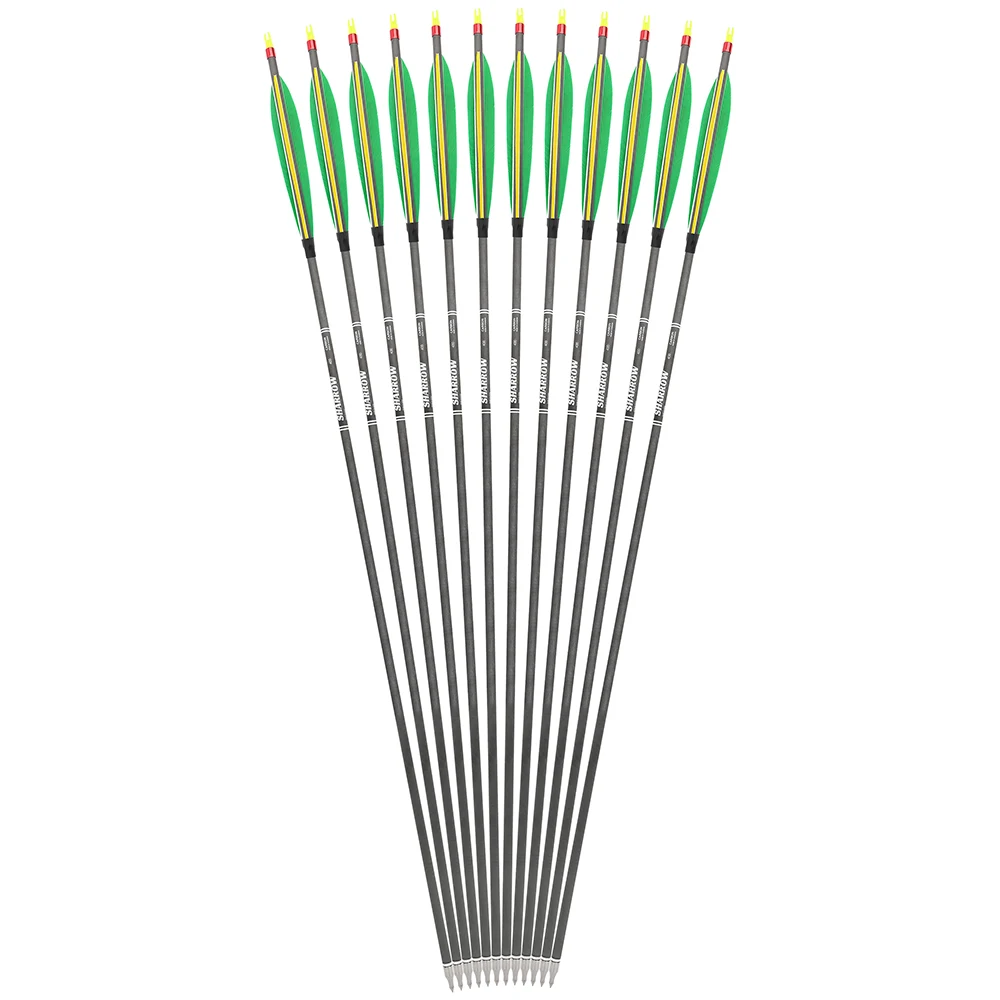 Nombre: Flecha de carbono para tiro con arco de 31,5 pulgadas Material: Flecha de alto carbono mezclado (carbono puro + carbono mezclado) Pluma de flecha: plumas de pavo de 6 pulgadas ID: 6,2 mm OD: 7,34 mm Lomo: 400 Casquillo: Casquillo inserido Longitud del eje de la flecha: 76,2 cm (30 pulgadas) Longitud de la flecha: 80,4 cm (31,5 pulgadas) Punta de flecha: 100 granos (con arandela negra) Peso de la flecha: alrededor de 27,5 g-28,6 g/unidad Cantidad: 6/12 piezas Para: arco recurvo/arco tradicional/arcos compuestos tiro con arco caza