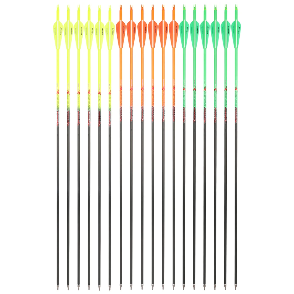 -Nombre del artículo: flechas de carbono puro para tiro con arco -Color: naranja, amarillo, verde (si necesita mezclar colores, contáctenos; de lo contrario, lo enviaremos al azar) -Pomo: 300/350/400/500/600 -Material de la pluma: Fletching de goma de 3 pulgadas -Dirección:+_ 0,006 -ID: 6,2 mm -OD: 7,38 mm (espina 350) 【La columna diferente tiene un diámetro exterior diferente】 -Longitud del eje de flecha: 81,3 cm/32 pulgadas -Longitud total: 85,2 cm/33.54 pulgadas -Peso: alrededor de 27 g/unidad (espina 350) -Uso para: caza/tiro/tirar con arco -Cantidad: 6/12 piezas Características: 1.Diseñado con precisión a partir de fibra de carbono de grado aeroespacial para una rigidez inigualable y cero deformaciones, lo que garantiza una precisión sub-MOA. 2.Aerodinámica avanzada - Con triples paletas de goma de 3 pulgadas, reducen significativamente la resistencia al viento para caminos de vuelo más rectos y estables. 3. Compatibilidad versátil - Diseñados para arcos compuestos, arcos recurvos y arcos largos, lo que los hace perfectos para tiro con arco competitivo, práctica de tiro con arco y caza.