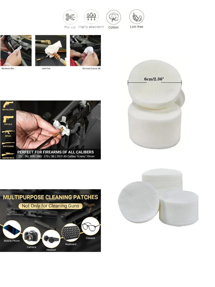 4. 【Juego de suministros de limpieza de armas】 Estos pequeños parches de limpieza para armas de fuego tienen solo 2 pulgadas de ancho y son compatibles con la mayoría de las armas. Funciona muy bien para la limpieza y el mantenimiento de armas, se utiliza como paño limpiador de rifle/pistola/tabrocas, perfecto para los distintos calibres de armas.22/. 30/.308/.380/.270 /.38 /.357/.45 Calibe/ 9 mm/ 10 mm