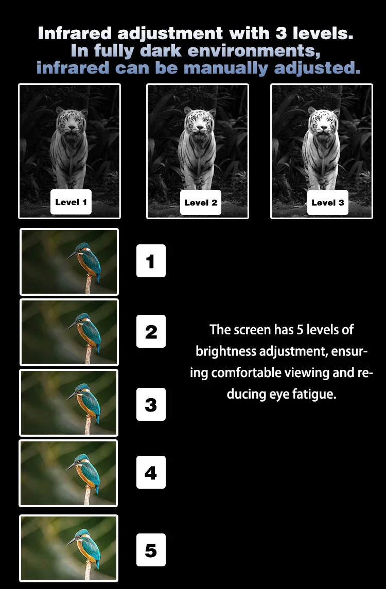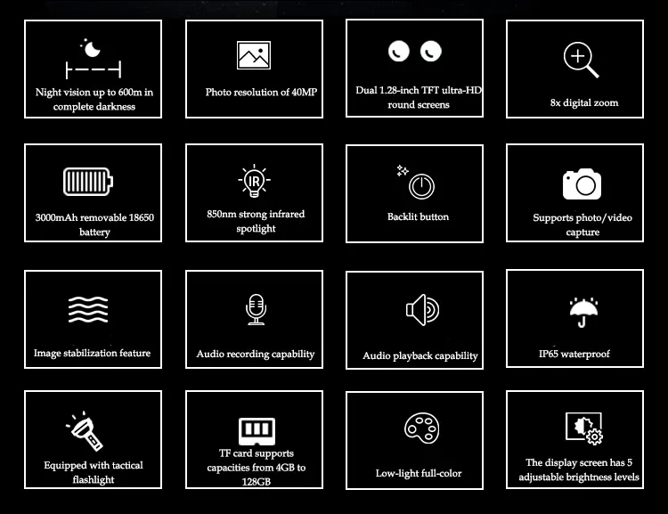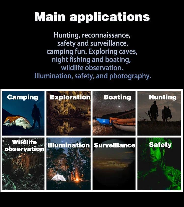 Caza, reconocimiento, seguridad y vigilancia, diversión para acampar, exploración de cuevas, pesca nocturna y paseos en bote, observación de vida silvestre, iluminación, seguridad y fotografía, etc.