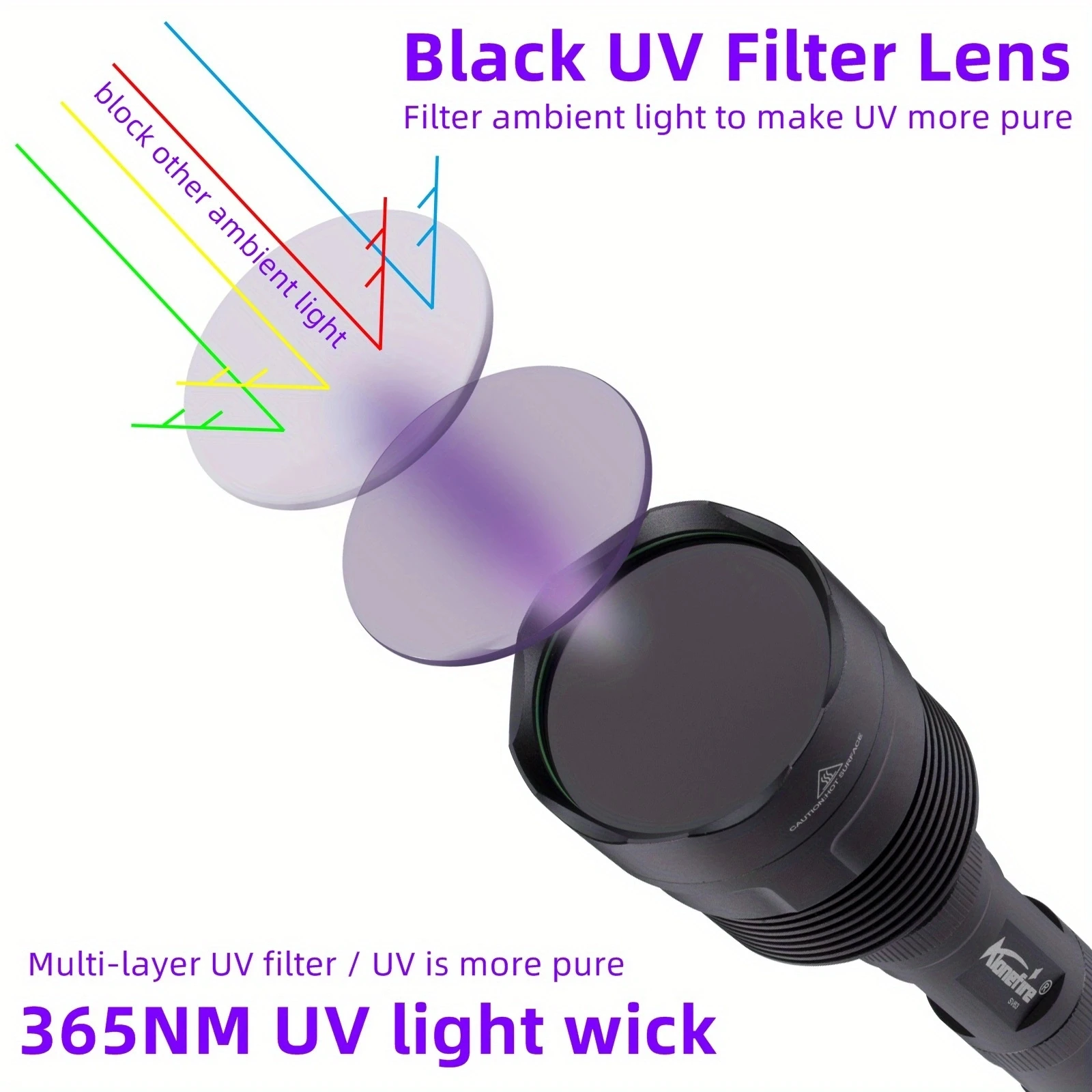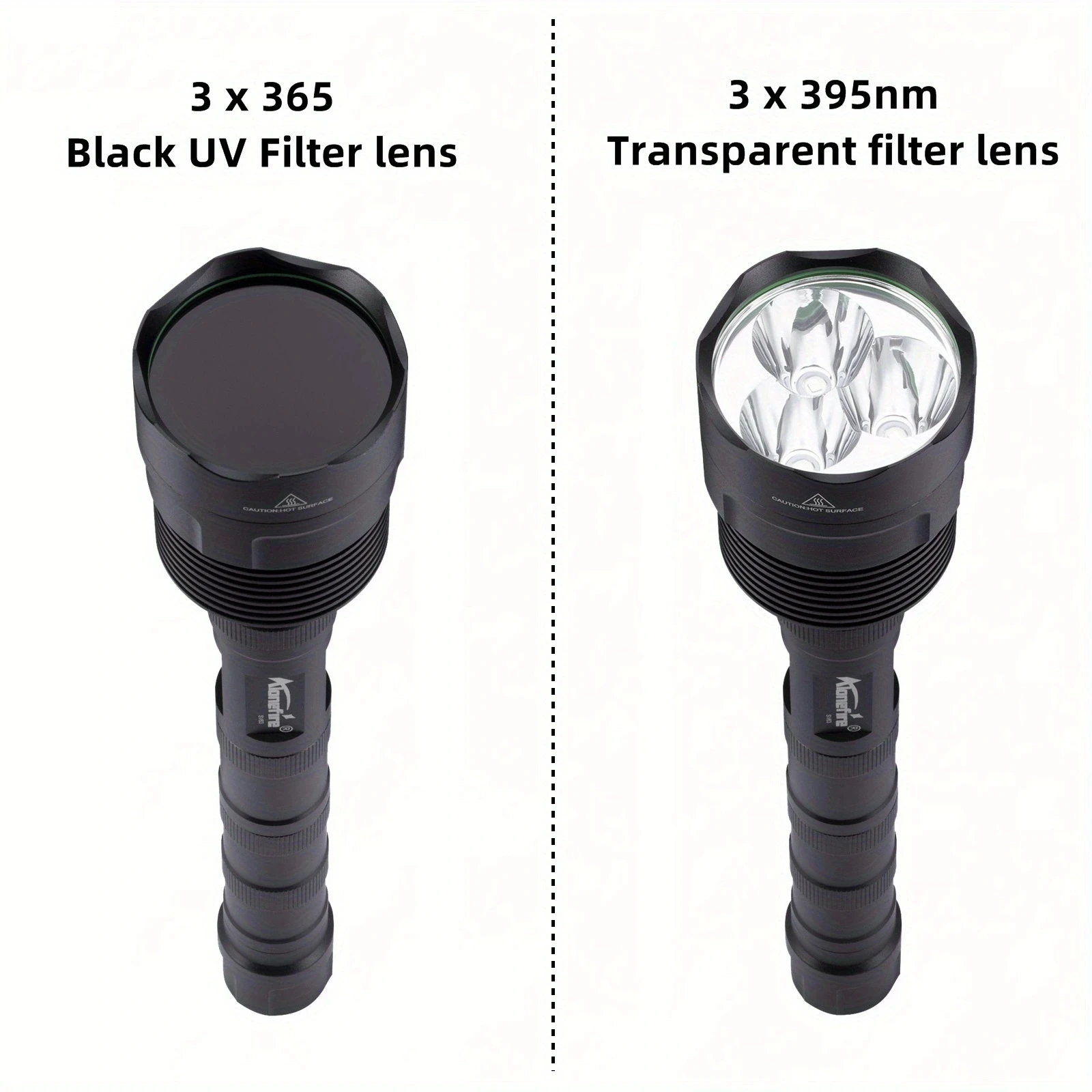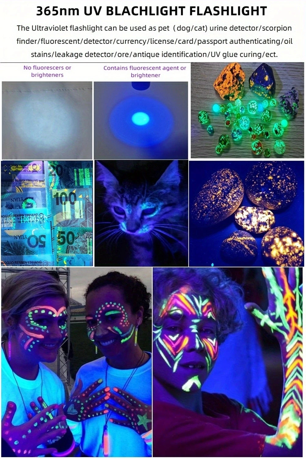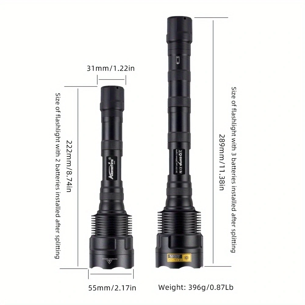 La luz ultravioleta de 365 nm es invisible a simple vista, por lo que no es tan BRILLANTE como la linterna de 395 nm, sino más perfecta para detectar una alta demanda como agentes fluorescentes y códigos de seguridad.UV de 365 nm es el espectro de detección realmente dedicado.Se puede utilizar con luz natural y funciona mejor en la oscuridad con poca fuga de luz visible.Se puede utilizar como detector de orina para mascotas (perros/gato)/escorpión/buscador/fluorescente/detector/censo de moneda/tarjeta/