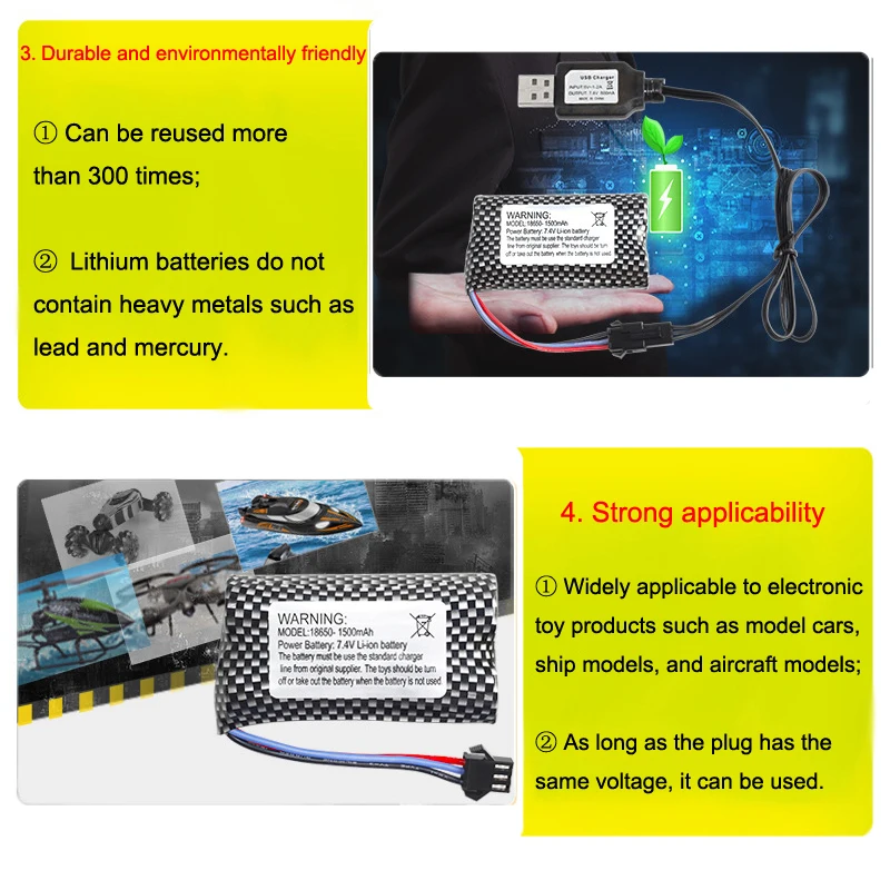 Batería de litio con enchufe SM-3P de 1500 mAh con cable de carga USB para DE43 DE60 RC Racing RC Batería de coche 1575 camión volquete Construcción vehículo de juguete