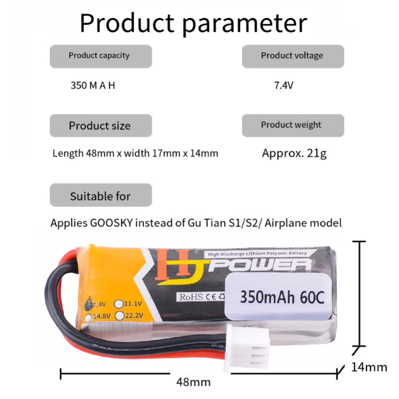 7,4 V 350mAh 2S 60C Lipo batería XH-3P enchufe para GOOSKY acrobacia aérea 3D helicóptero Valley Sky S1/S2
