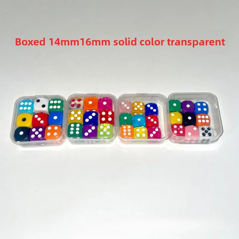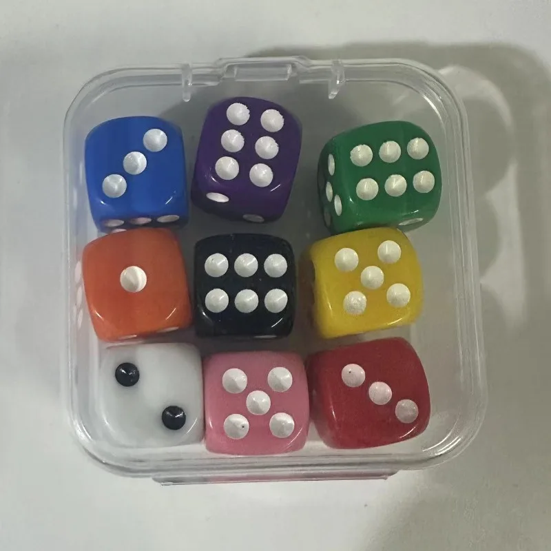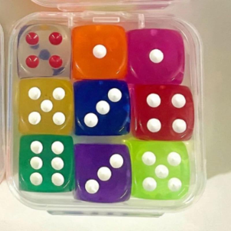 El dado transparente no está. Lo han substituido por otro dado de otro color, también con los puntos blancos. Son bonitos!