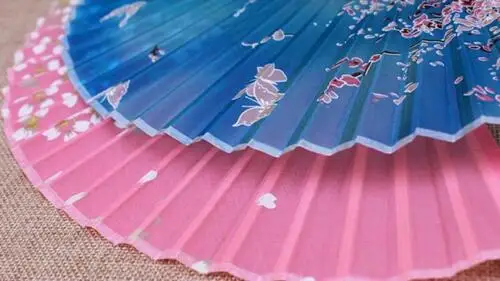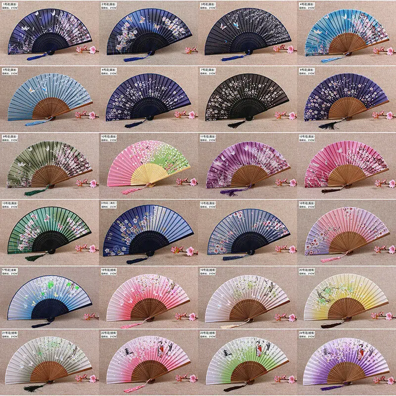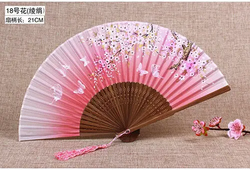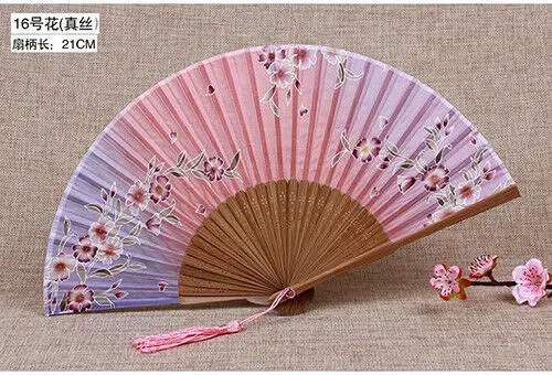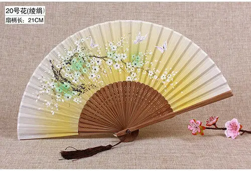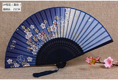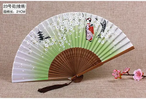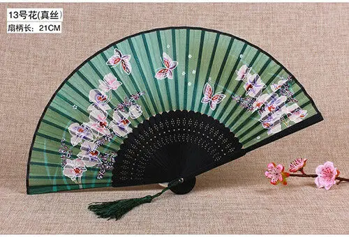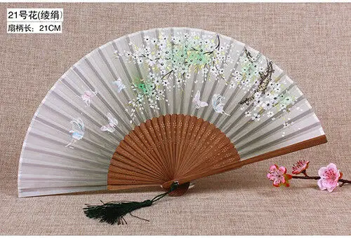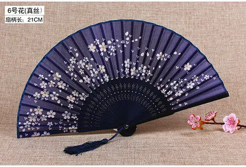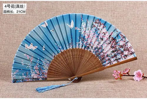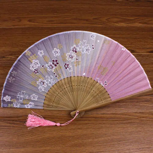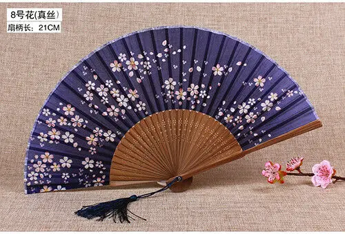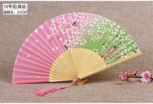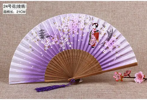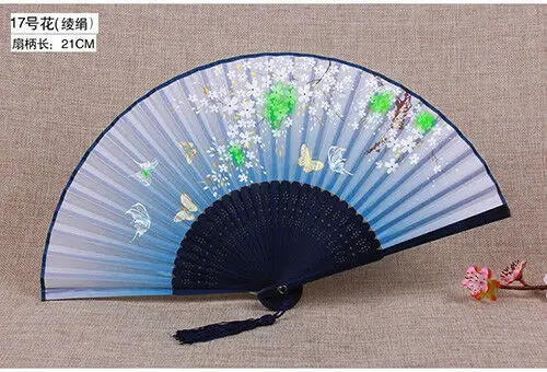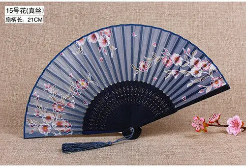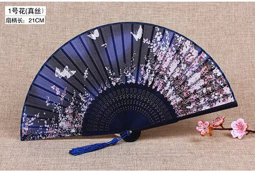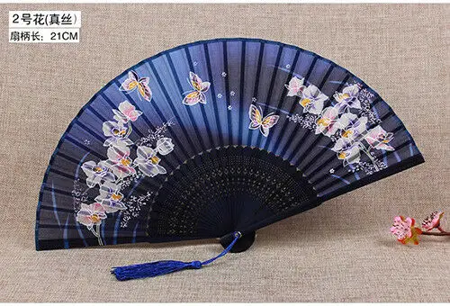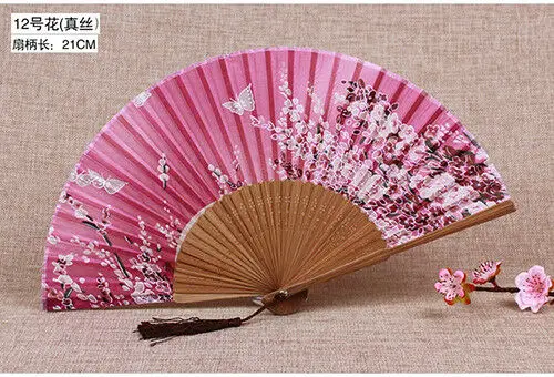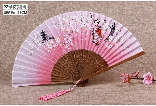 Seda/seda satinada 2 en forma de abanico, proceso de impresión, este abanico femenino con características chinas. Nombre: Abanico femenino con fideos de seda Estilo: tamaño japonés: 21cm con un diámetro de aproximadamente 38cm. Material: seda Proceso: impresión El paquete incluye: 1 ventilador de estilo japonés