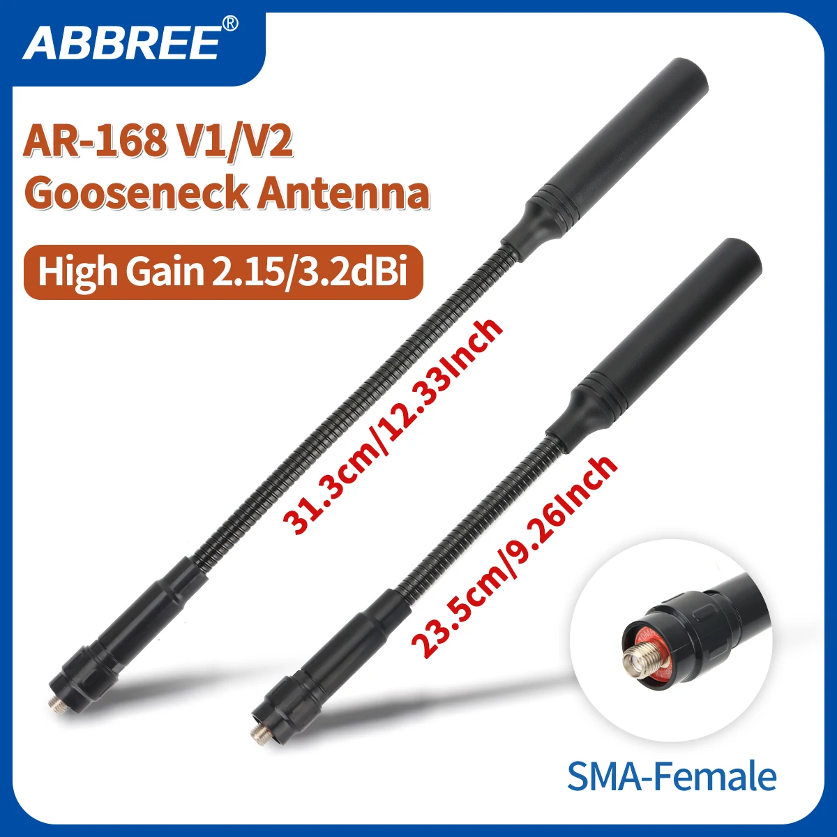 1.El AR-168 V1/V2 cuello de cisne Antennahas23.5CM/31.3 CM de longitud para elegir.Además, es una necesidad para uso en exteriores y camping.Con ganancia 2.15/3.2dBi, esta antena amplifica las señales, mejora el alcance y la calidad de sus transmisiones de radio y garantiza una comunicación clara y confiable.