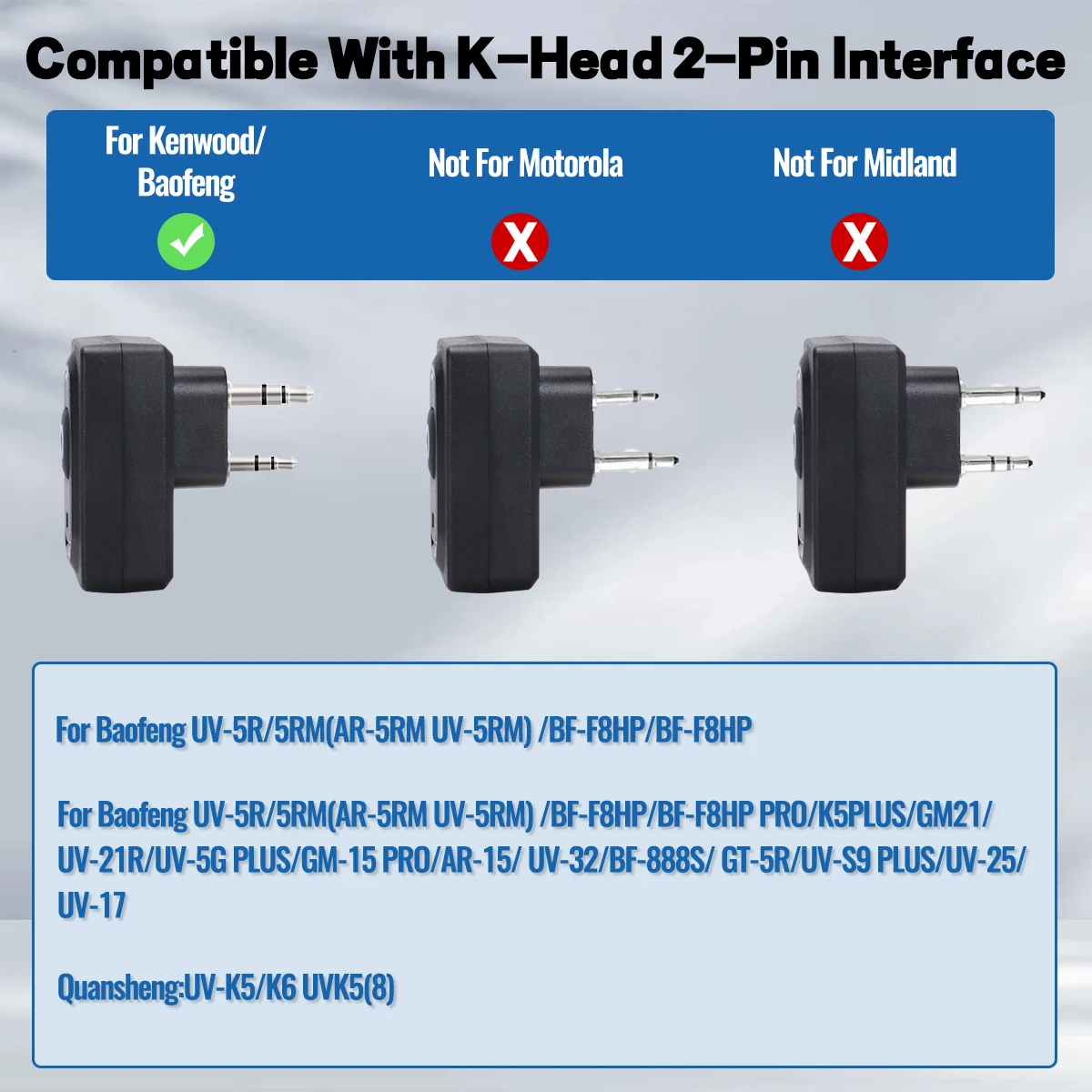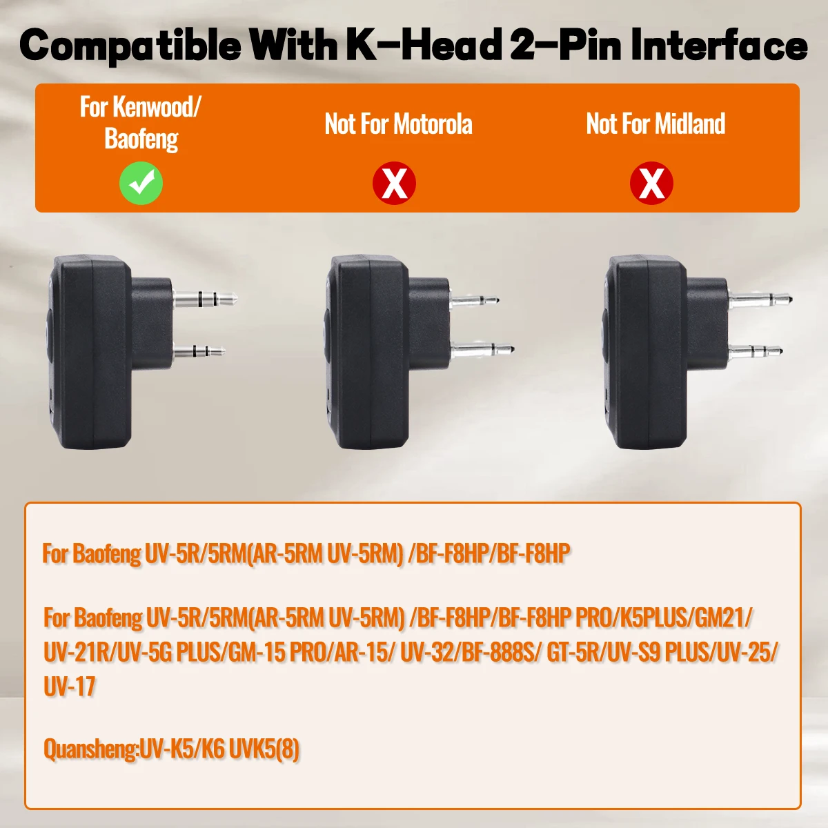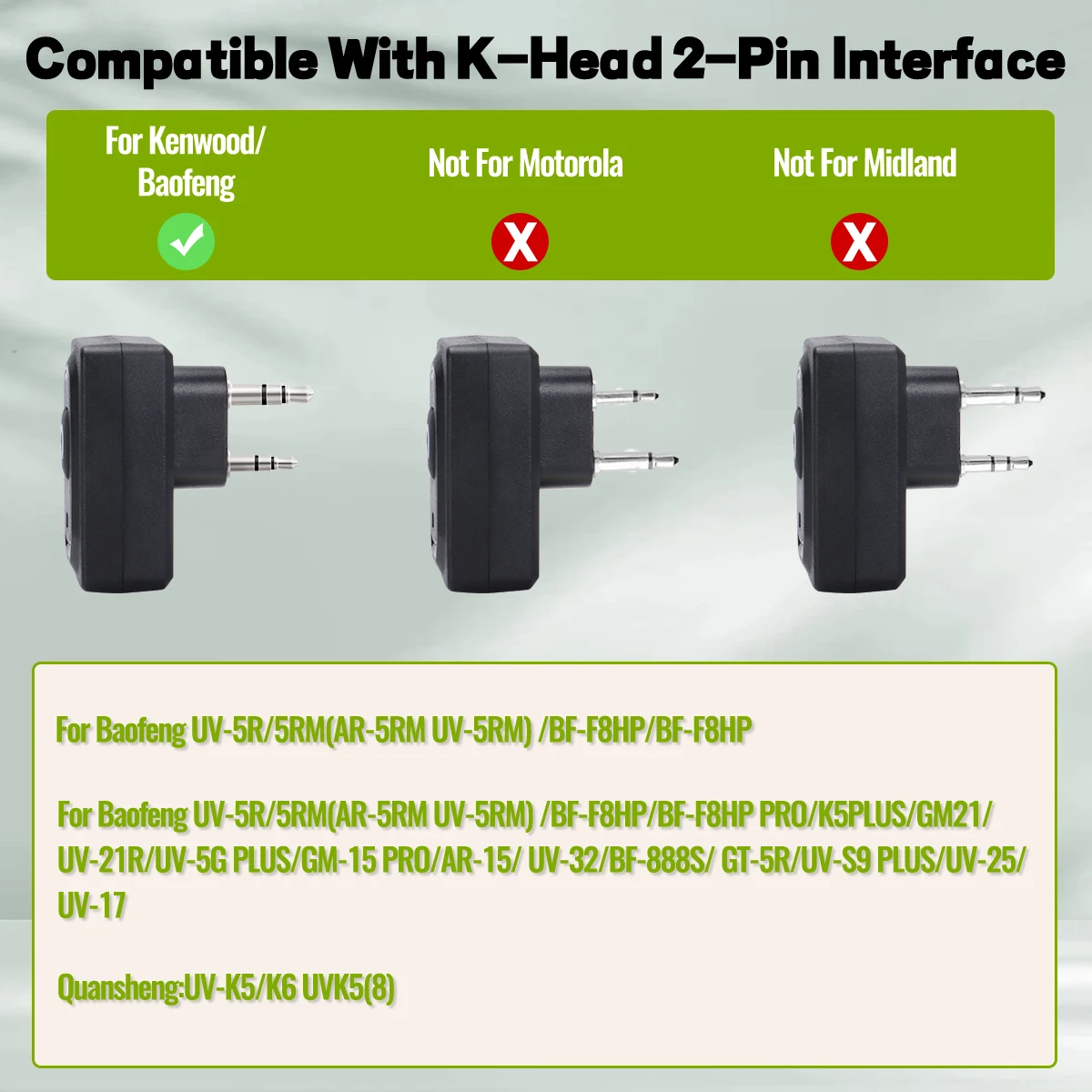 👍【 Compatibilidad 】:Compatible con la radio bidireccional Baofeng Kenwood Retevis PXTON WEIRWEI TYT PUXING WOUXUN con conector de audio de dos pines tipo K, que incluye Baofeng UV-5R, BF-F8HP, BF-F8, UV-5R+PLUS, BF-888S, UV -82, UV-82HP, UV-S9, GM-15 PRO, UV-13 PRO, M-13 PRO, UV-21 PRO, UV-21 PRO, UV-21 GPS, UV-21M, BF-888S, UV-5RQuansheng UV-K5 K6 TK11 etc.