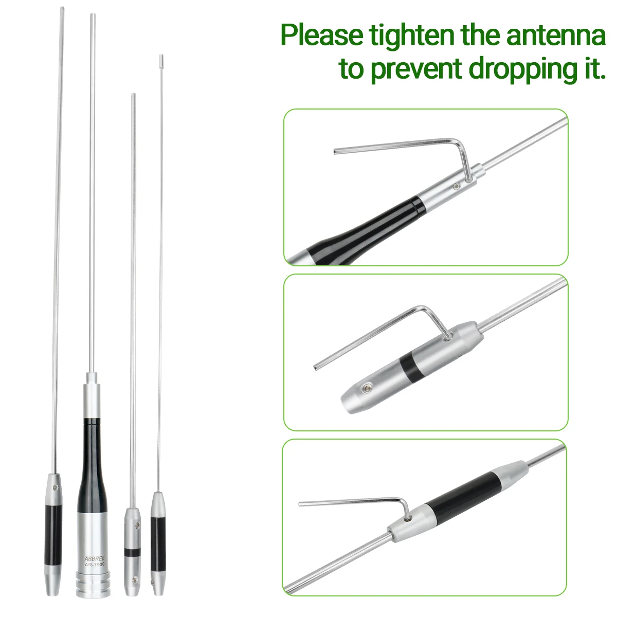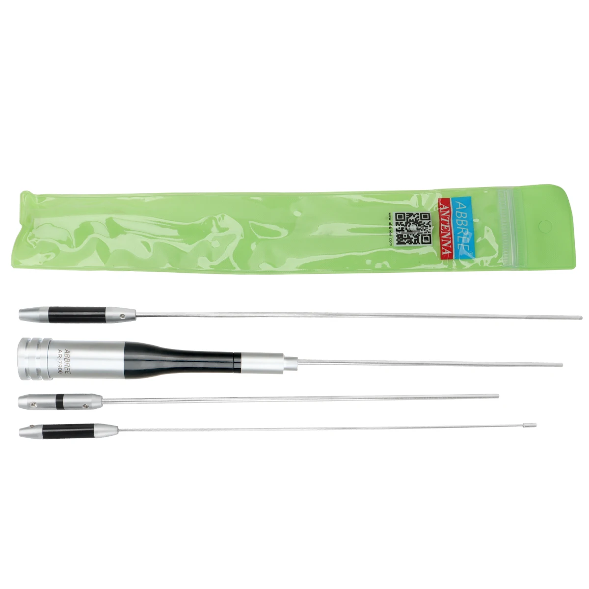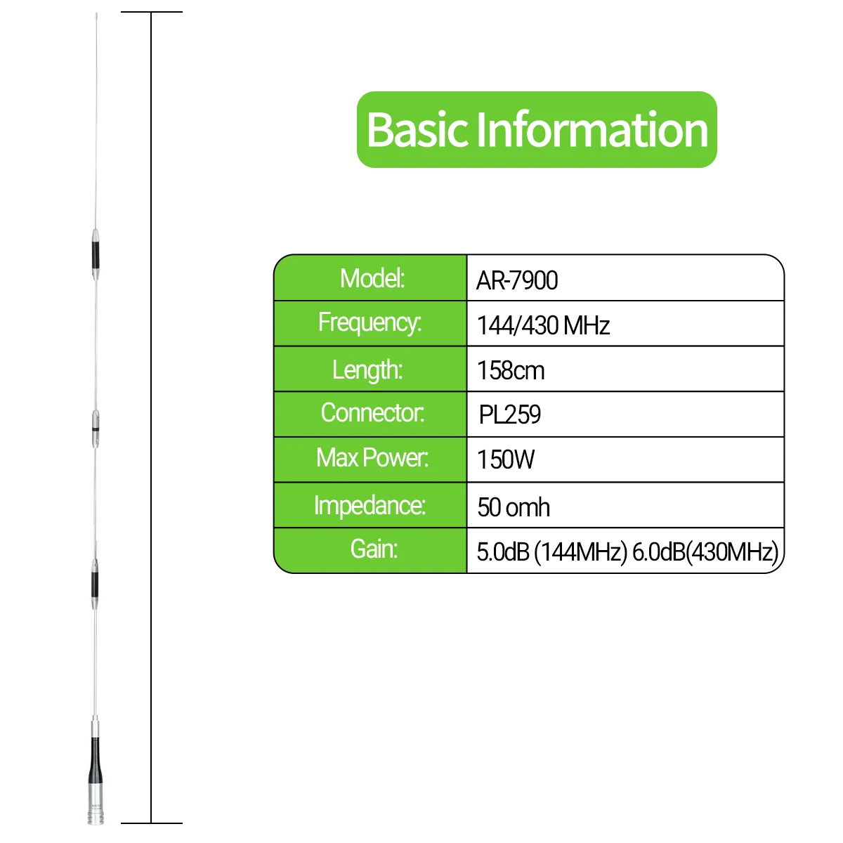 Longitud de la antena: 158 cm/62 pulgadas; Ganancia: 5,0 dBi (144 MHz) / 7,6 dBi (430 MHz)
