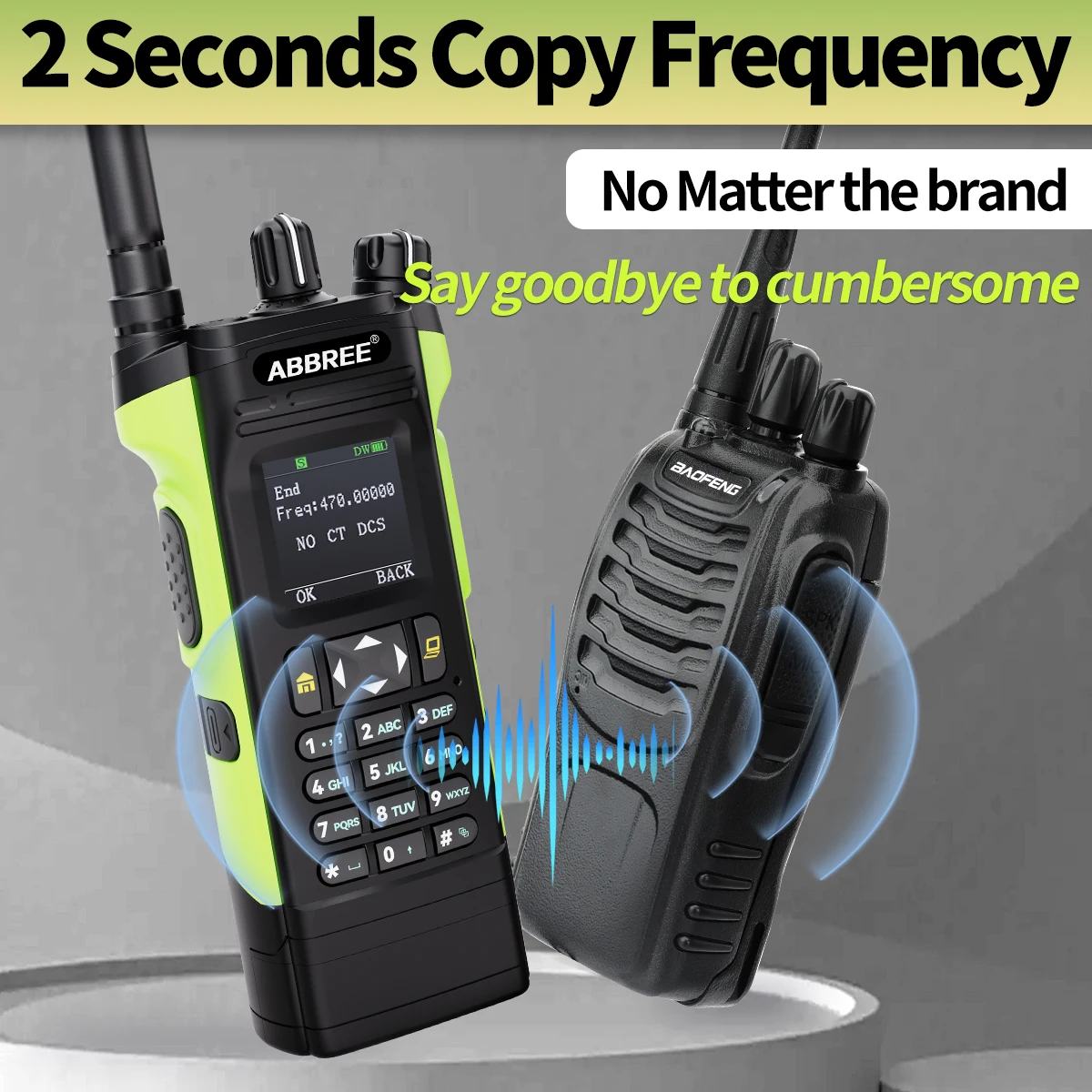 La función de frecuencia de copia rápida le permite copiar fácilmente la frecuencia de otros walkie talkies sin necesidad de programar por computadora.
