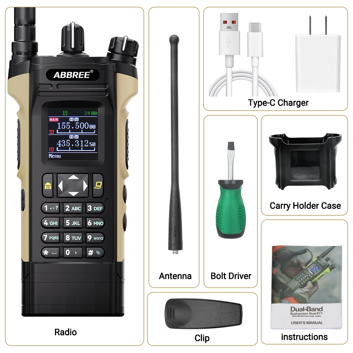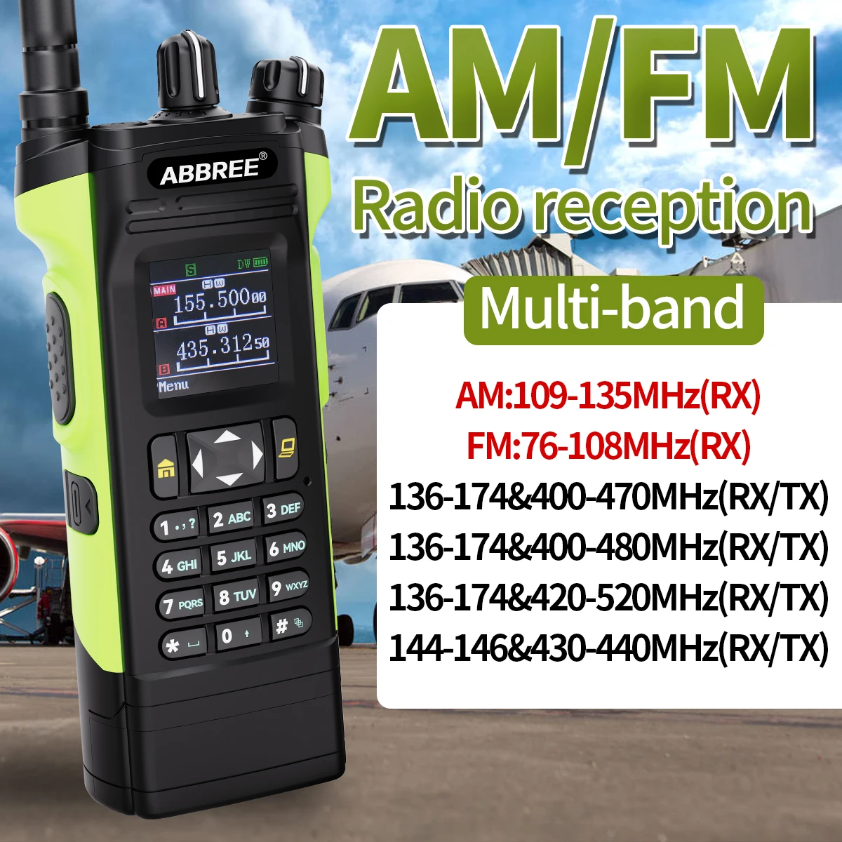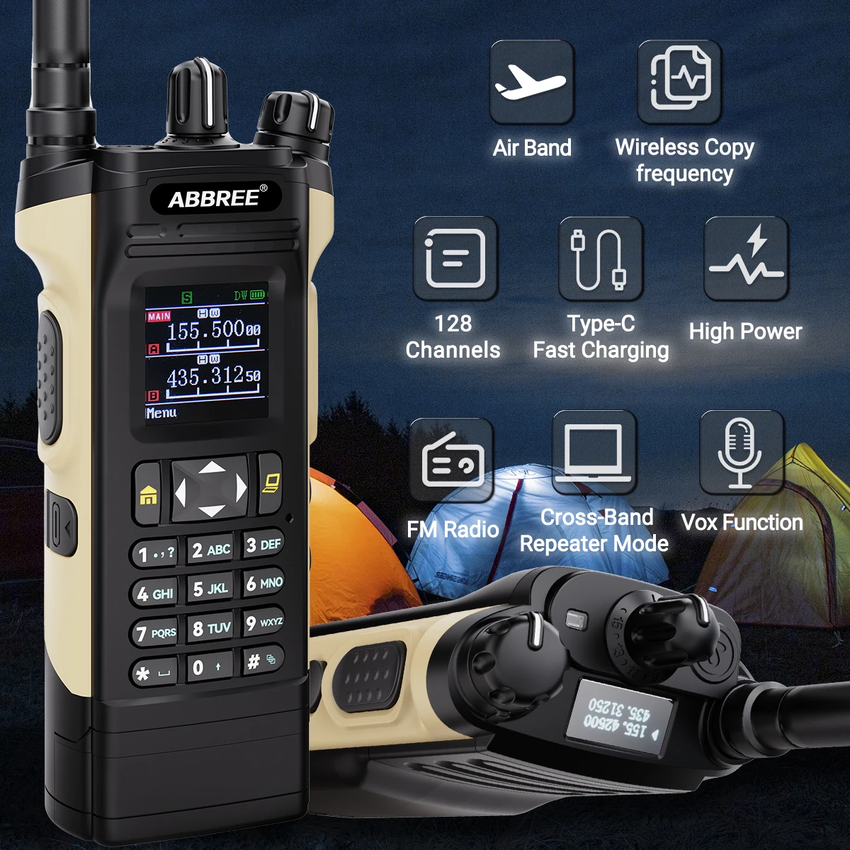 Hasta 128 canales, alta potencia de 12 W, frecuencia de aviación, radio FM, modo repetidor de banda cruzada, DTMF, VOX, función de alarma, batería de iones de litio de gran capacidad y otras funciones.